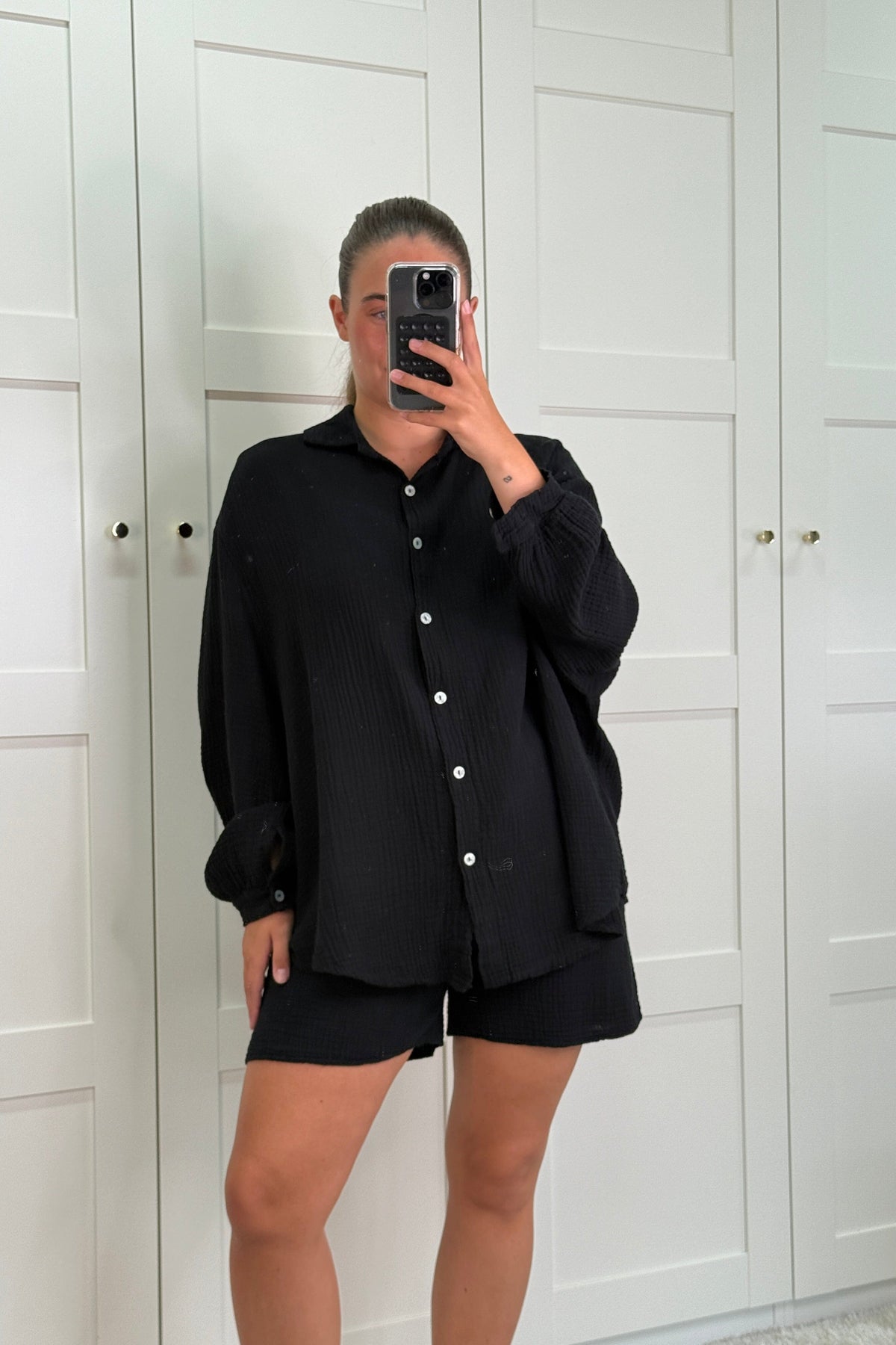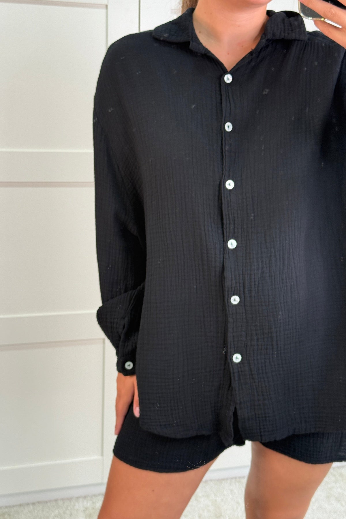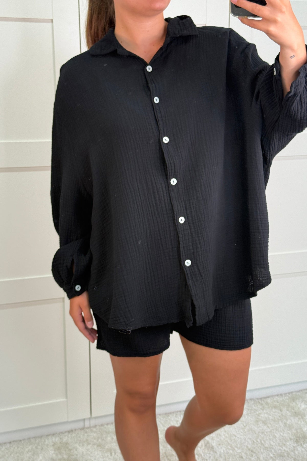 Schwarzes Set von A-bee in zwei Teilen mit Hemd und Shorts. Hergestellt aus reiner Baumwolle mit Knöpfen vorne am Hemd und Schnürung an den Shorts. Das Set hat eine lässige Passform.
