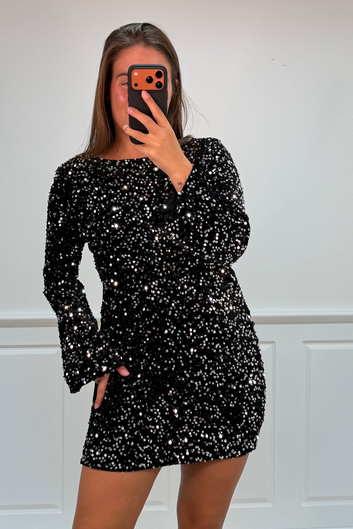 Festkleid von A-bee mit glitzernden Pailletten und Schleifendetails. Das Kleid hat eine schwarze Basis mit silberfarbenem Muster und langen Ärmeln. Der runde Ausschnitt und die Schleife auf dem Rücken verleihen dem Kleid eine festliche Note.