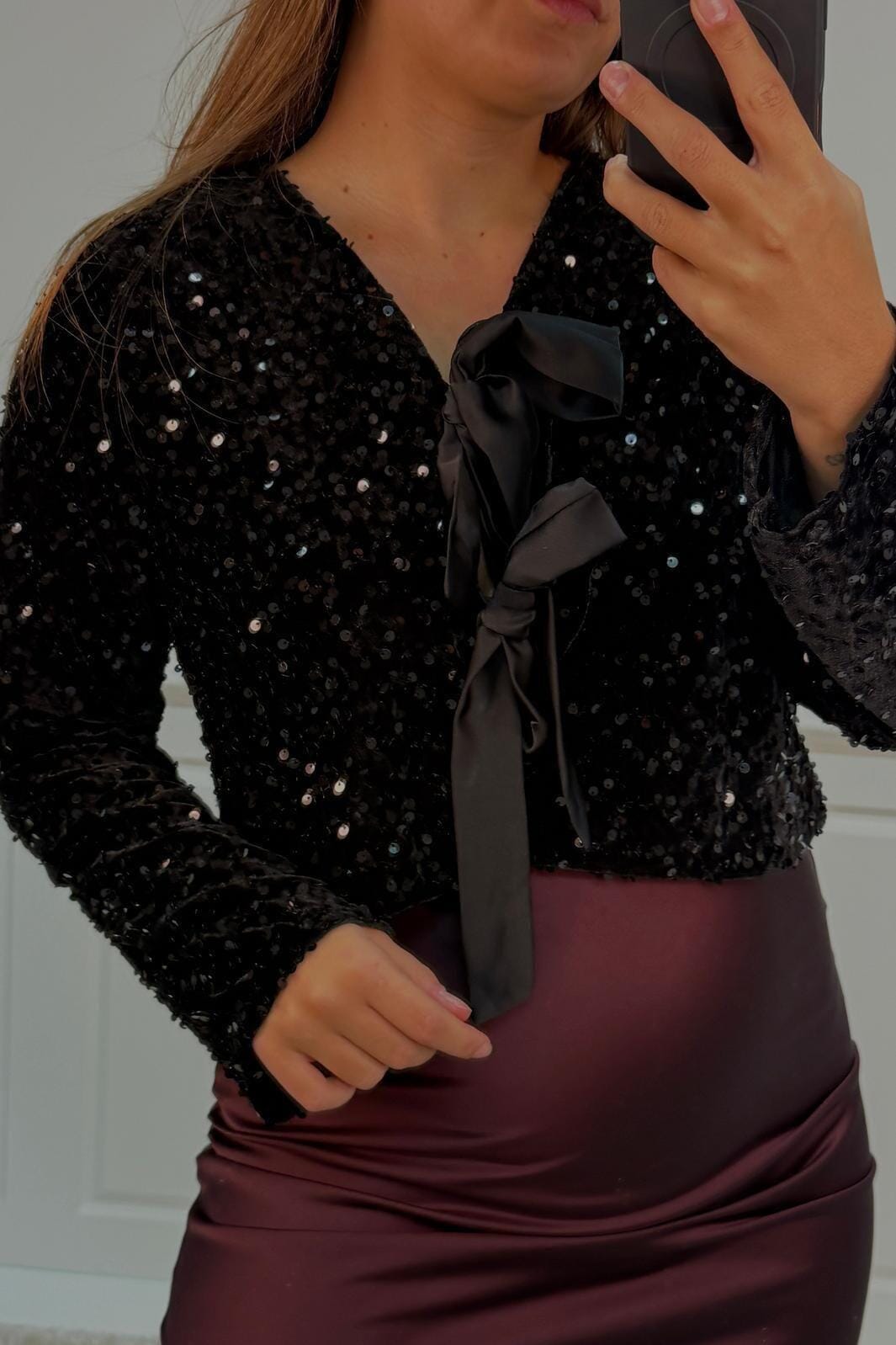 Schwarze Bluse von A-bee mit Pailletten und Schleifendetails. Die Bluse hat einen V-Ausschnitt mit Schnürverschluss und lange Ärmel. Die schimmernde Oberfläche und die dekorativen Schleifen machen sie geeignet für festliche Anlässe.