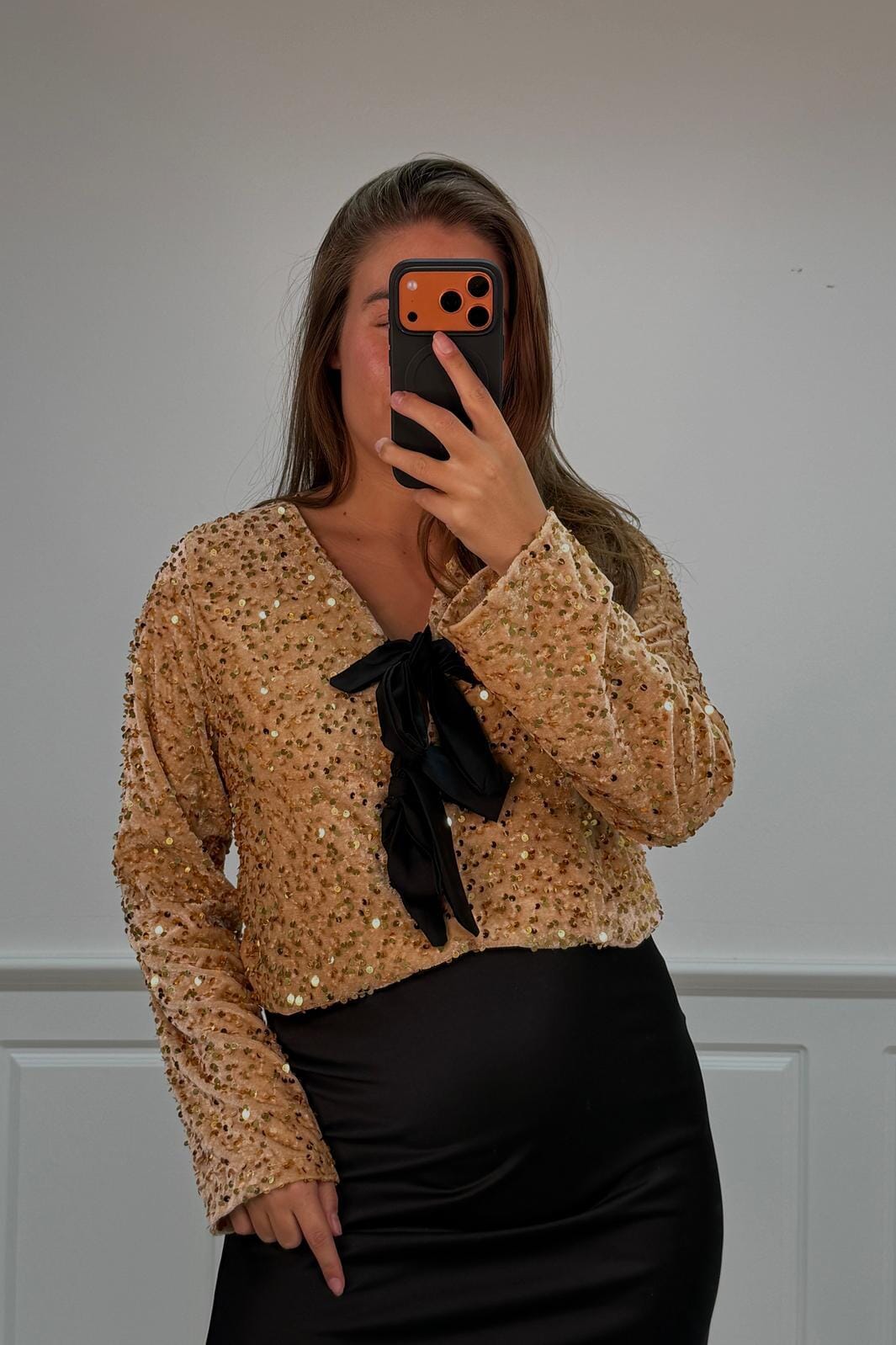 Goldfarbener Pullover von A-bee mit Pailletten auf der gesamten Oberfläche. Sie hat lange Ärmel, einen V-Ausschnitt und schwarze Schleifendetails am Hals.