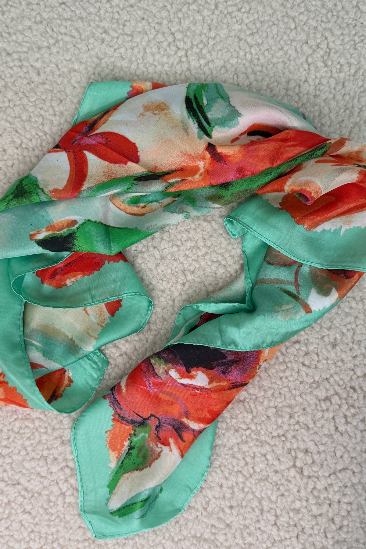 Grünes Tuch von A-bee mit einem floralen Print in orangefarbenen, roten und grünen Nuancen auf grünem Hintergrund.