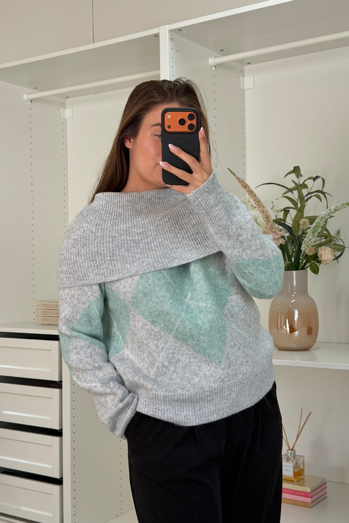 Strickpullover von A-bee in einer Kombination aus Grau und Grün. Der Pullover hat ein kariertes Rautenmuster mit melierten Details.