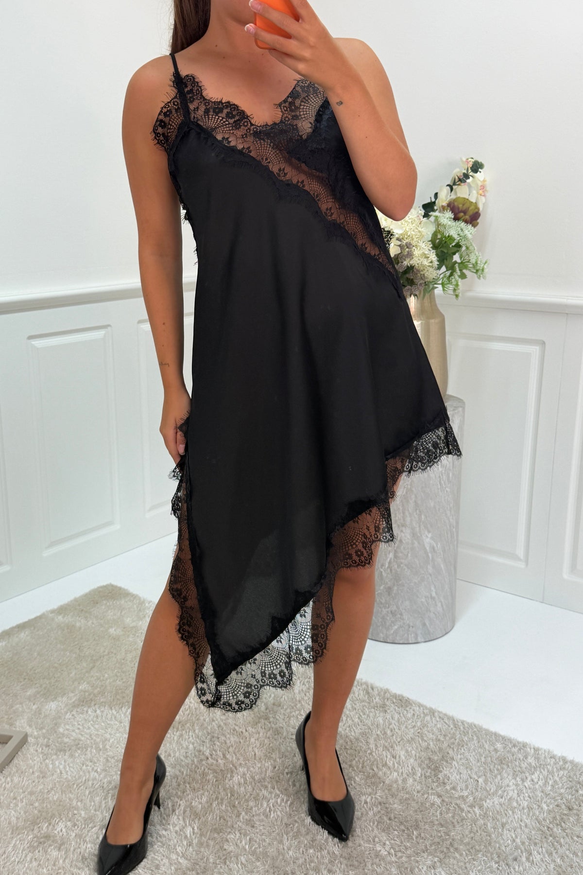 Schwarzes Festkleid von A-bee mit V-Ausschnitt und asymmetrischem Saum. Das Kleid hat Spitzenverzierungen entlang des Ausschnitts und des Saums, die dem Design einen feinen Ausdruck verleihen.