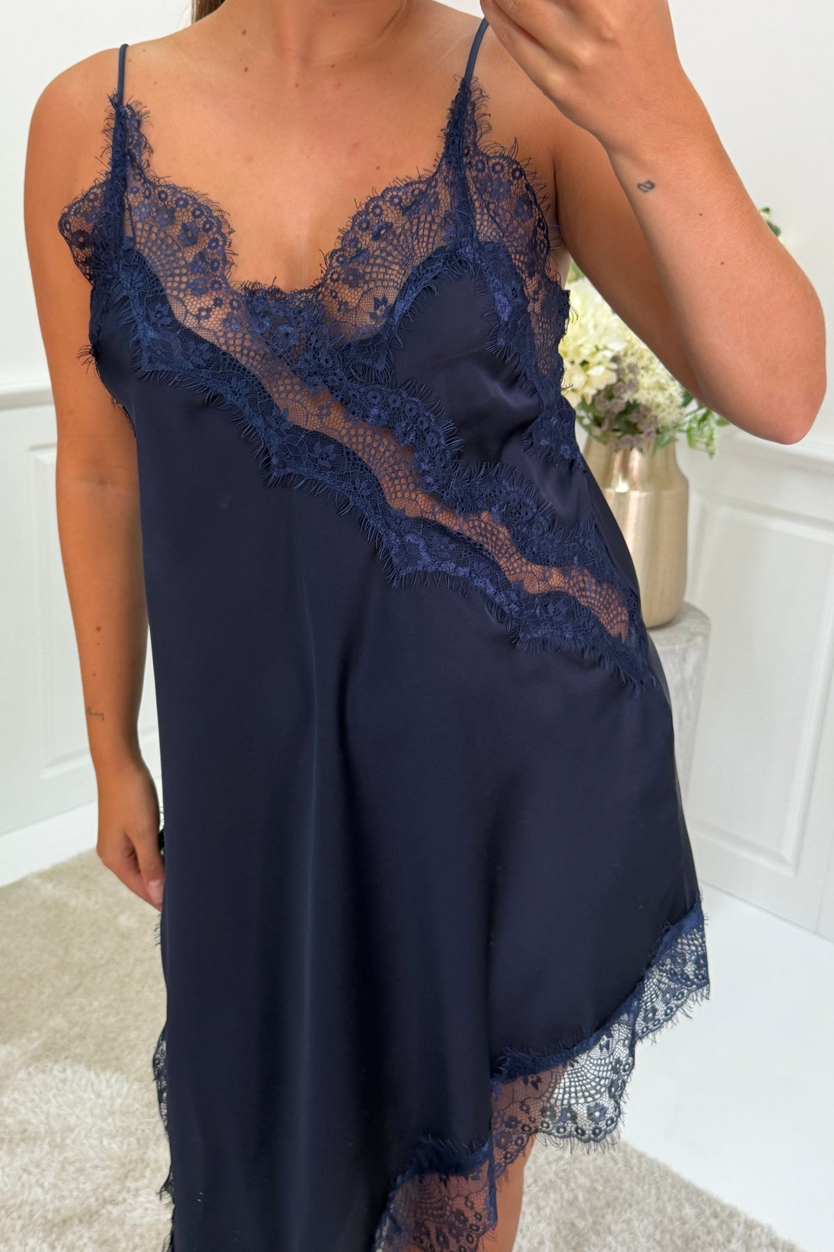 Dunkelblaue Kleid von A-bee mit lockerer Passform und asymmetrischem Saum. Das Kleid hat Spitzenakzente am Ausschnitt und entlang des Saums, sowie dünne Träger und einen V-Ausschnitt.