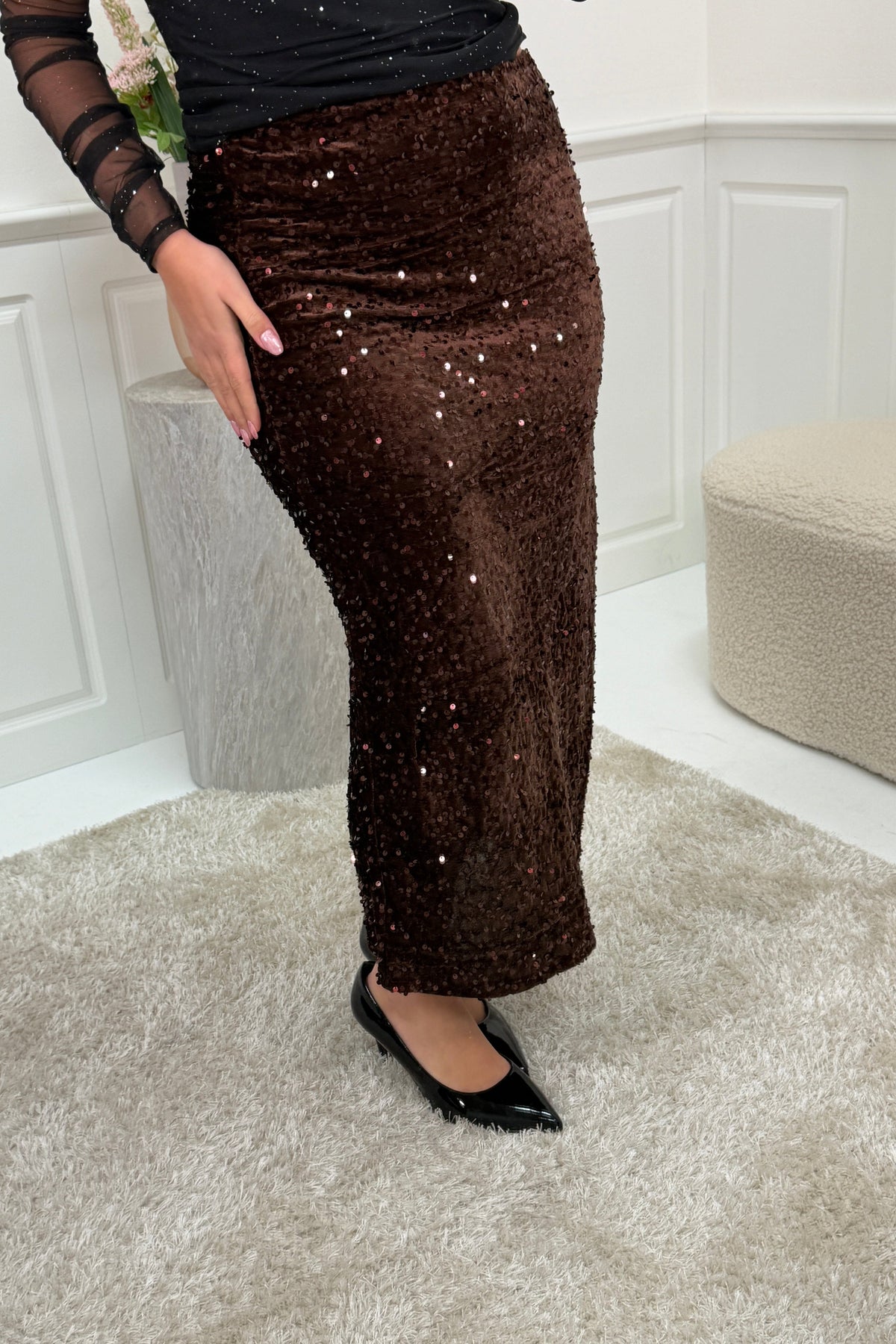 Rock von A-bee in dunklem Bordeaux, mit Pailletten über die gesamte Oberfläche bedeckt. Die hohe Taille und die schmale Passform reichen bis zu den Knöcheln.