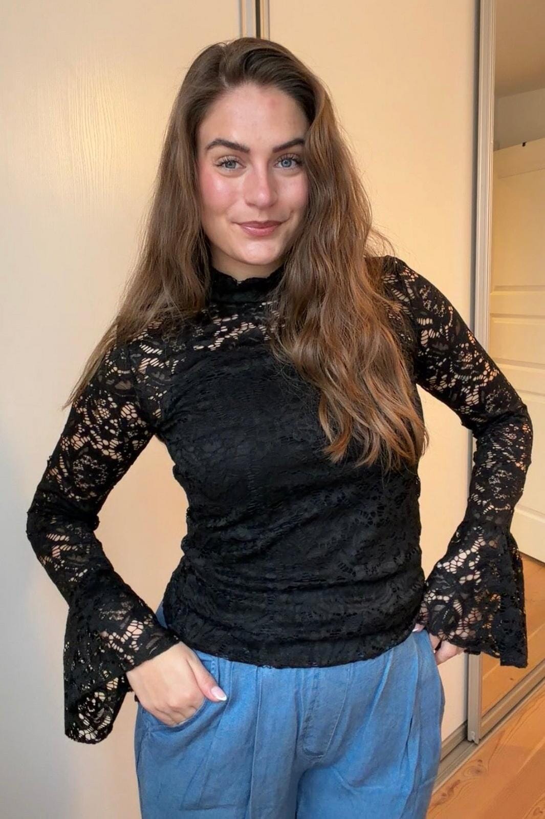 Schwarze Bluse von A-bee aus Polyamid und Elasthan. Die Bluse hat Spitze und Rüschen im Stoff.
