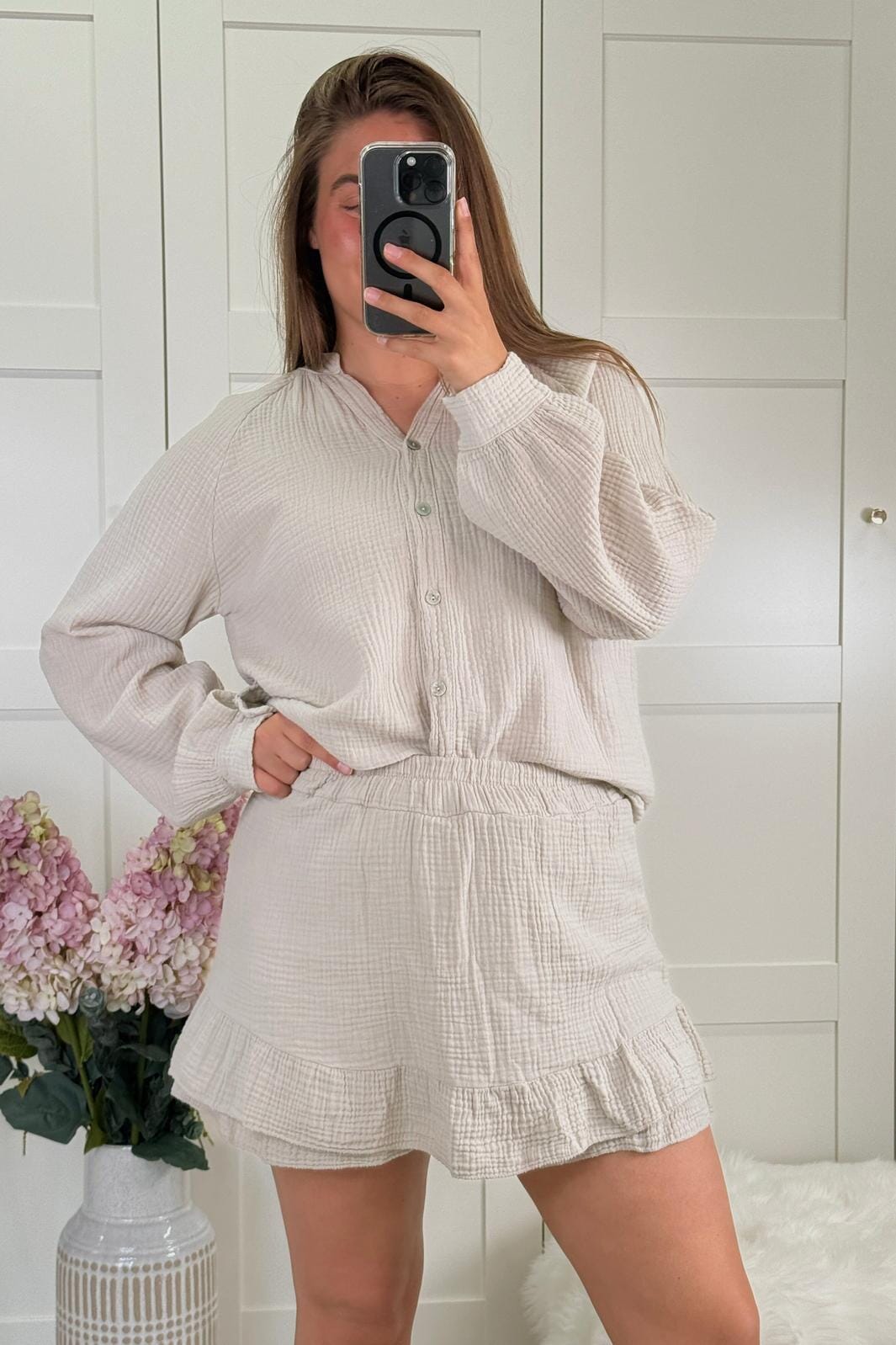 Beige Shorts von A-bee mit Volantkante. Die Shorts sind aus einem hellen beigen Baumwollstoff mit einer weichen Textur gefertigt und haben eine lockere Passform.