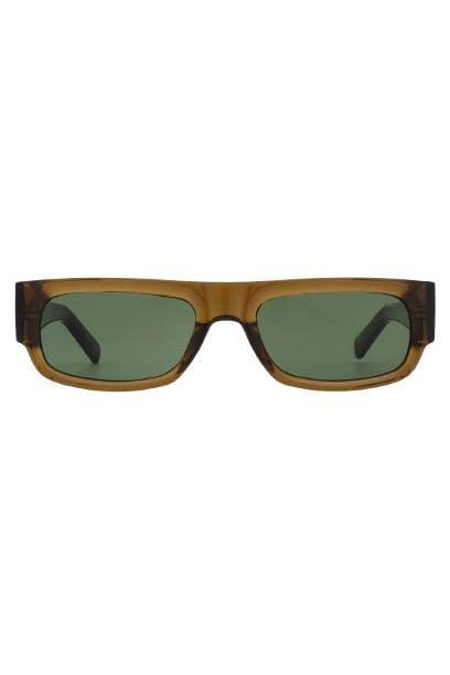 Sonnenbrillen von A. Kjærbede in transparentem Braun mit grünen Gläsern. Die Brillen haben eine rechteckige Form und bestehen aus dem leichten Material Tritan Renew.