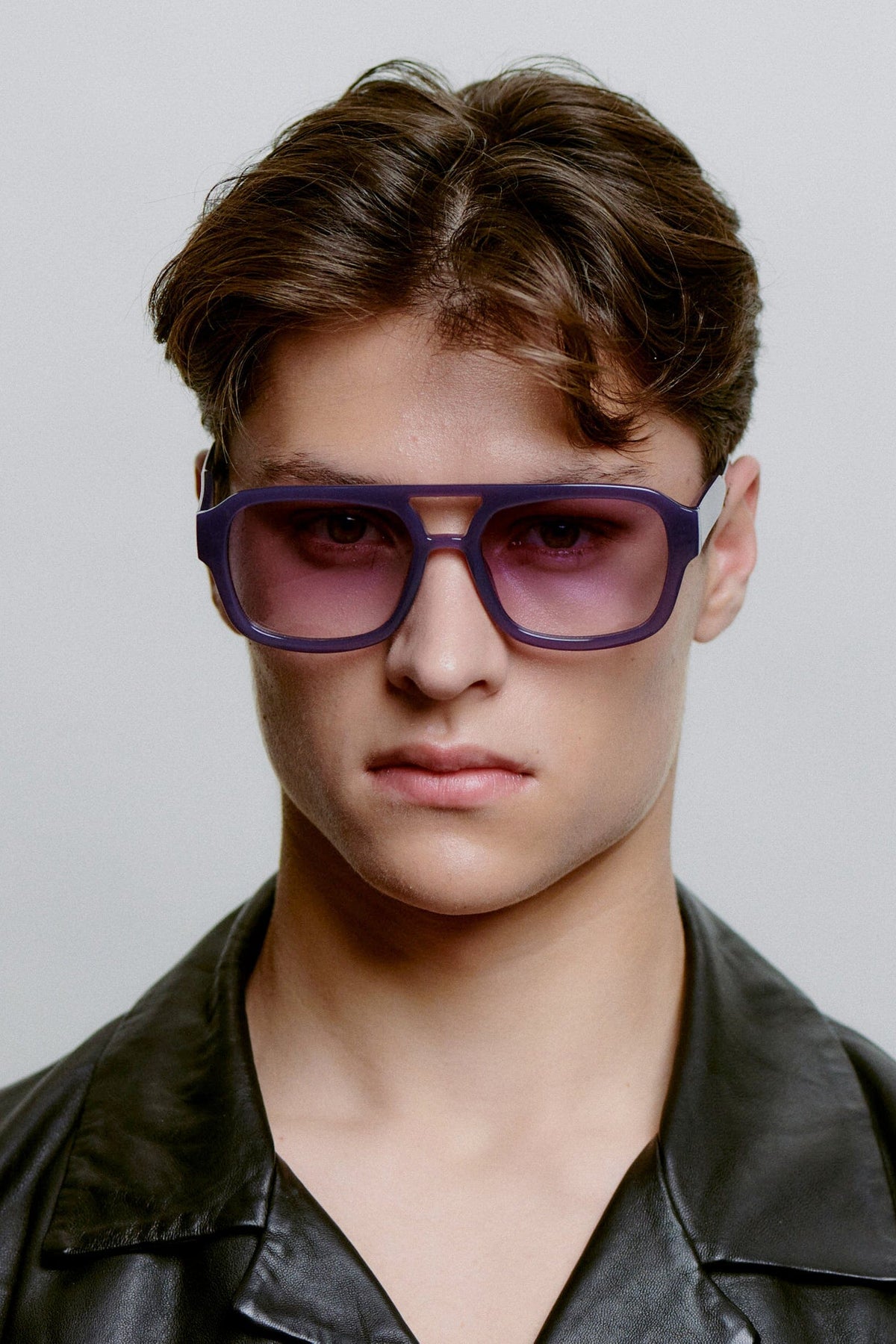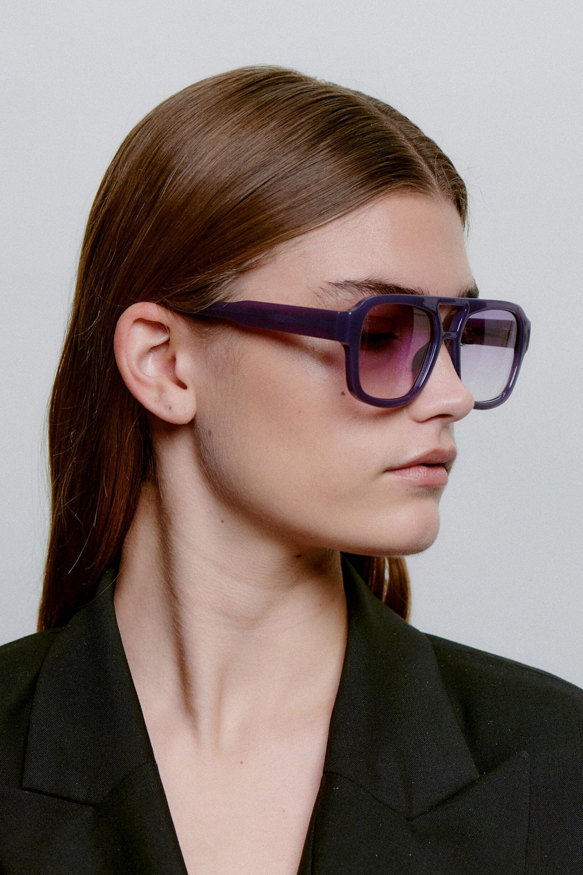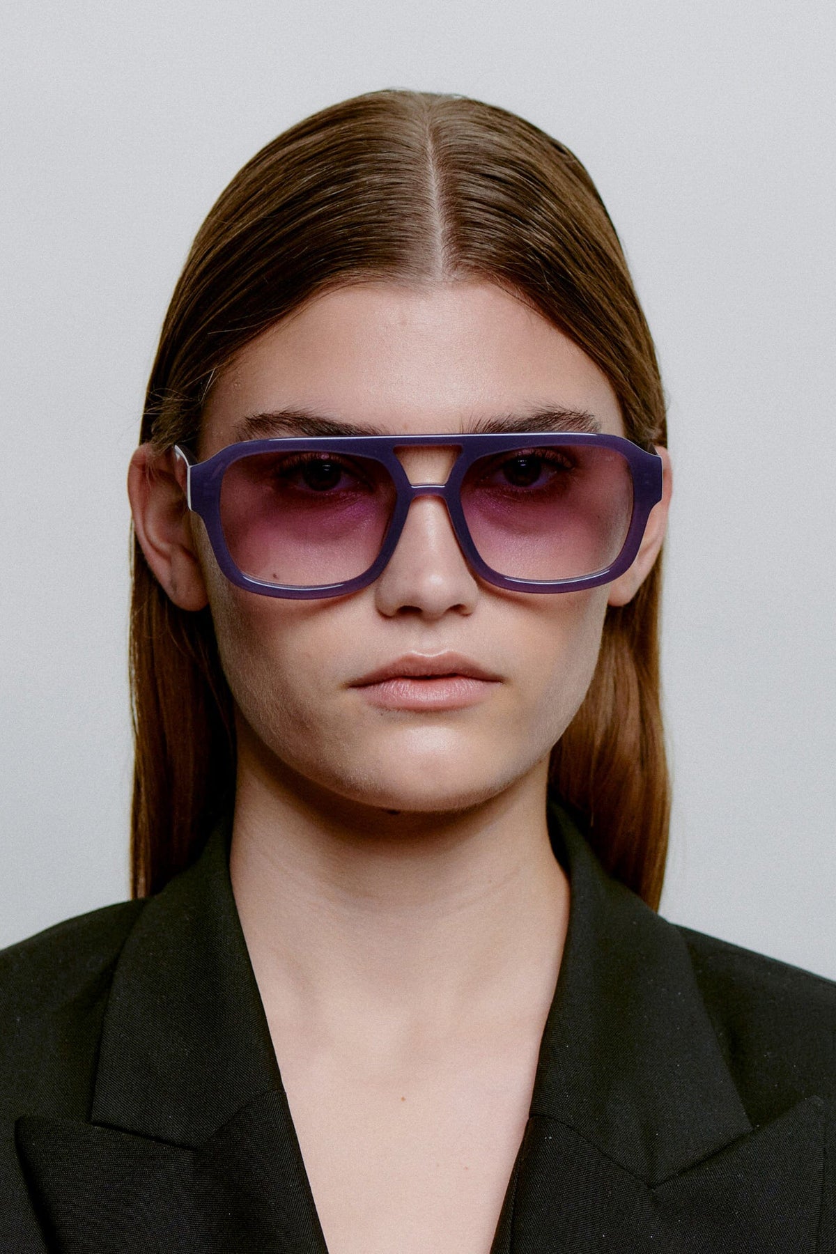 Sonnenbrillen von A. Kjærbede in lila Nuance mit Aviator-Rahmen. Der Rahmen hat Gradient-Gläser und besteht aus haltbarem Tritan Renew-Material mit UV 400-Schutz.
