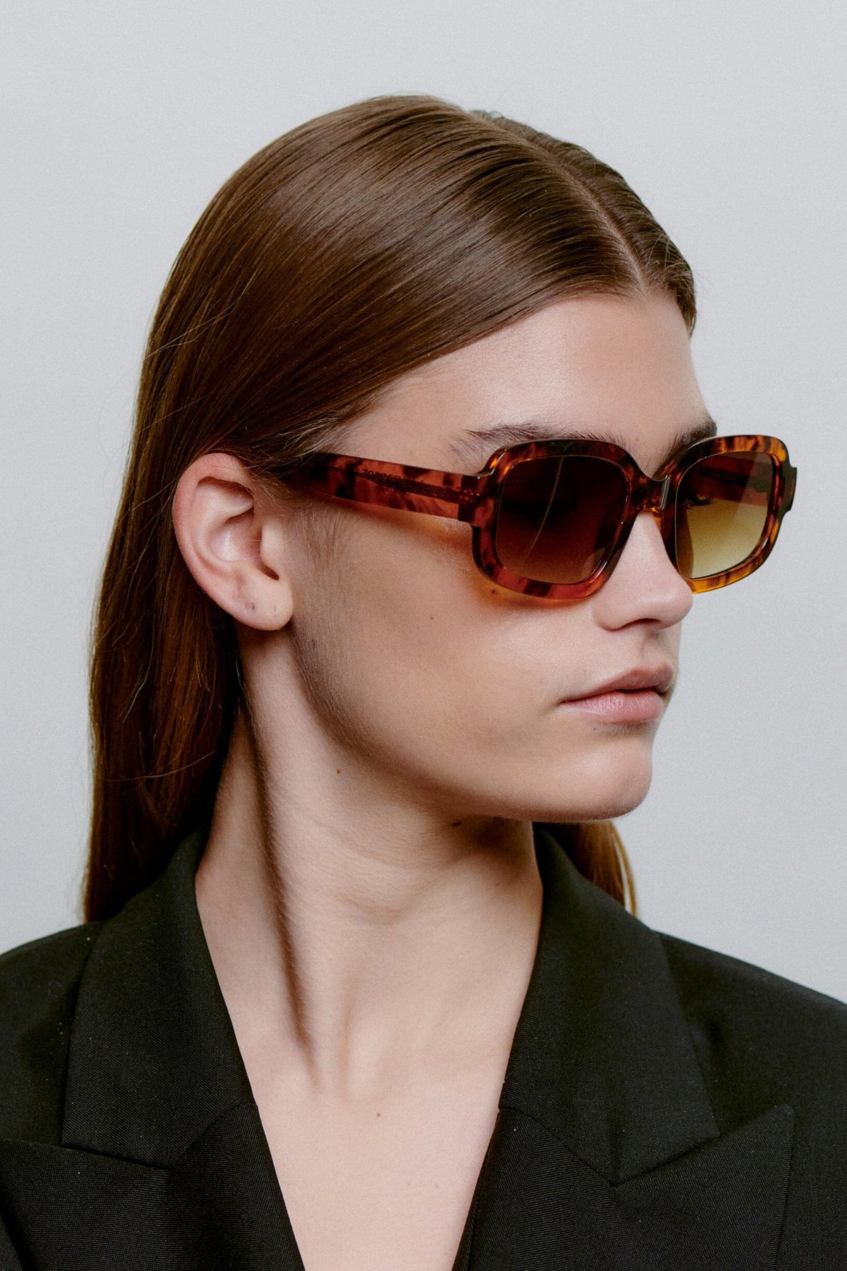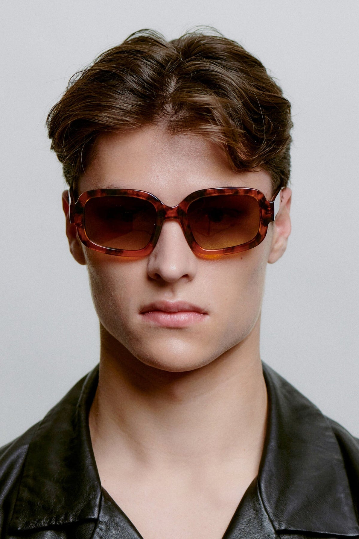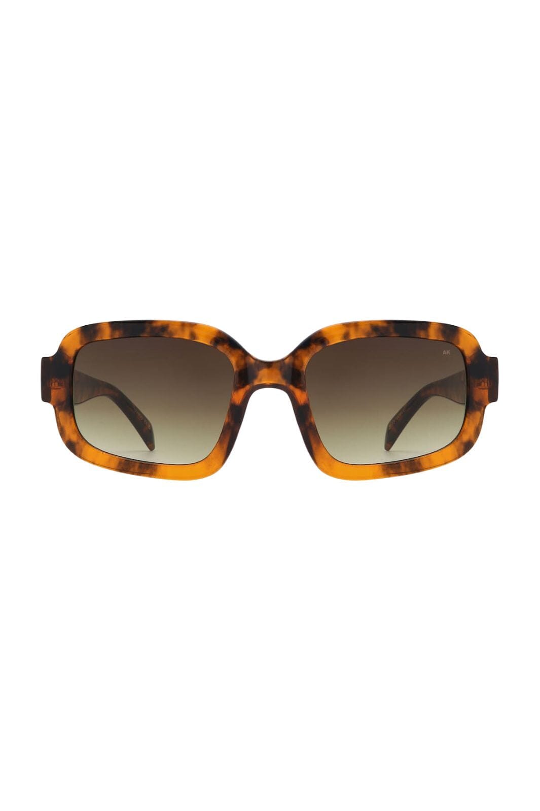 Sonnenbrillen von A. Kjærbede mit quadratischem Rahmen in brauner Havana-Farbe. Der Rahmen hat ein Schildpattmuster und getönte Verlaufslinsen mit einem stabilen Rahmen.