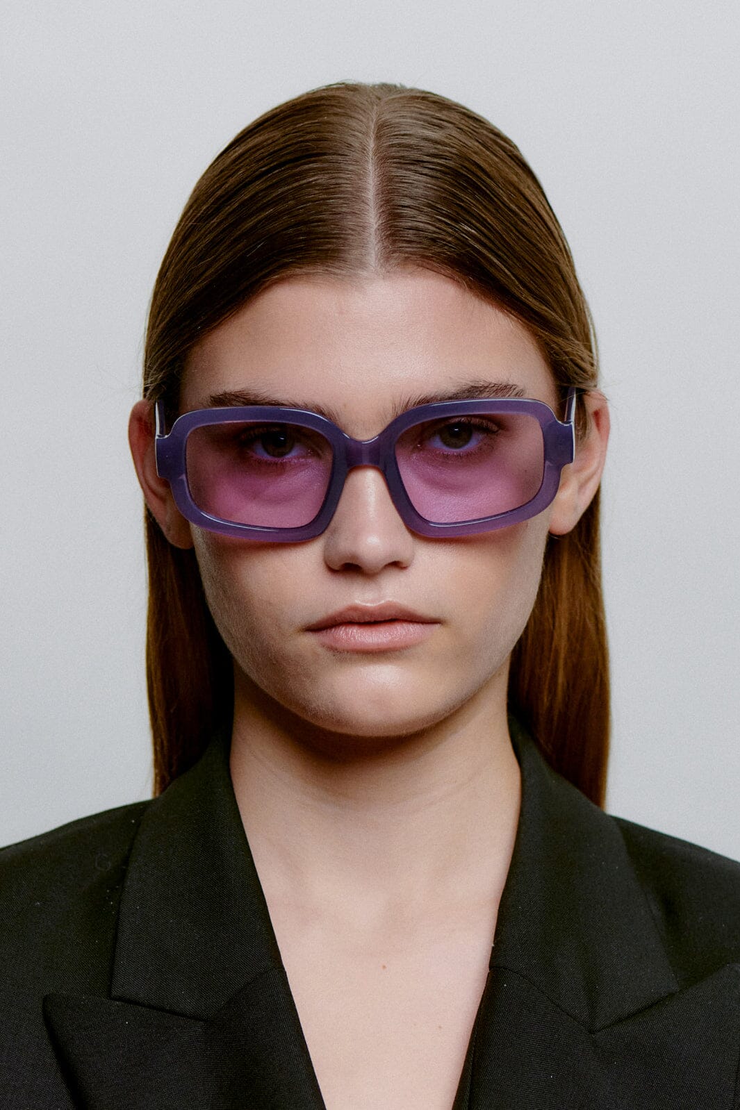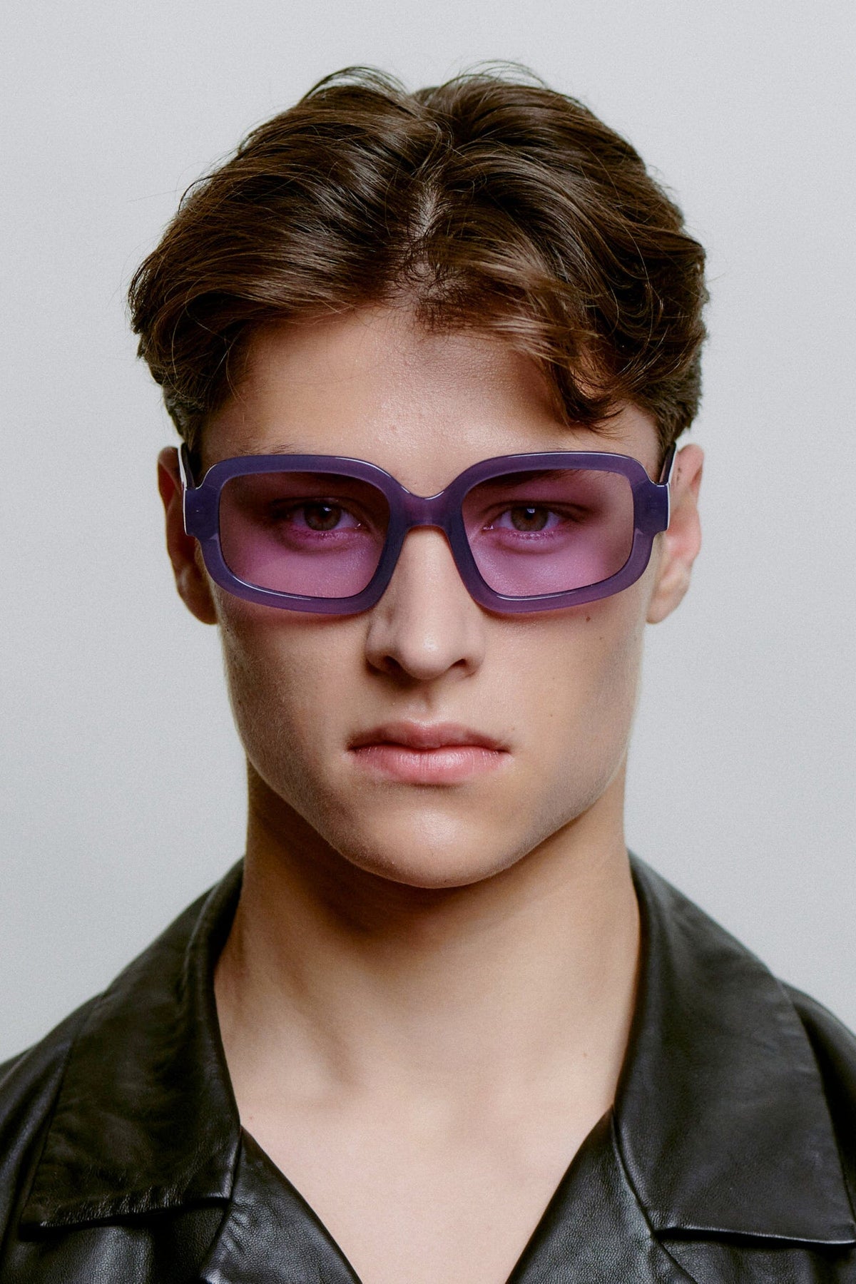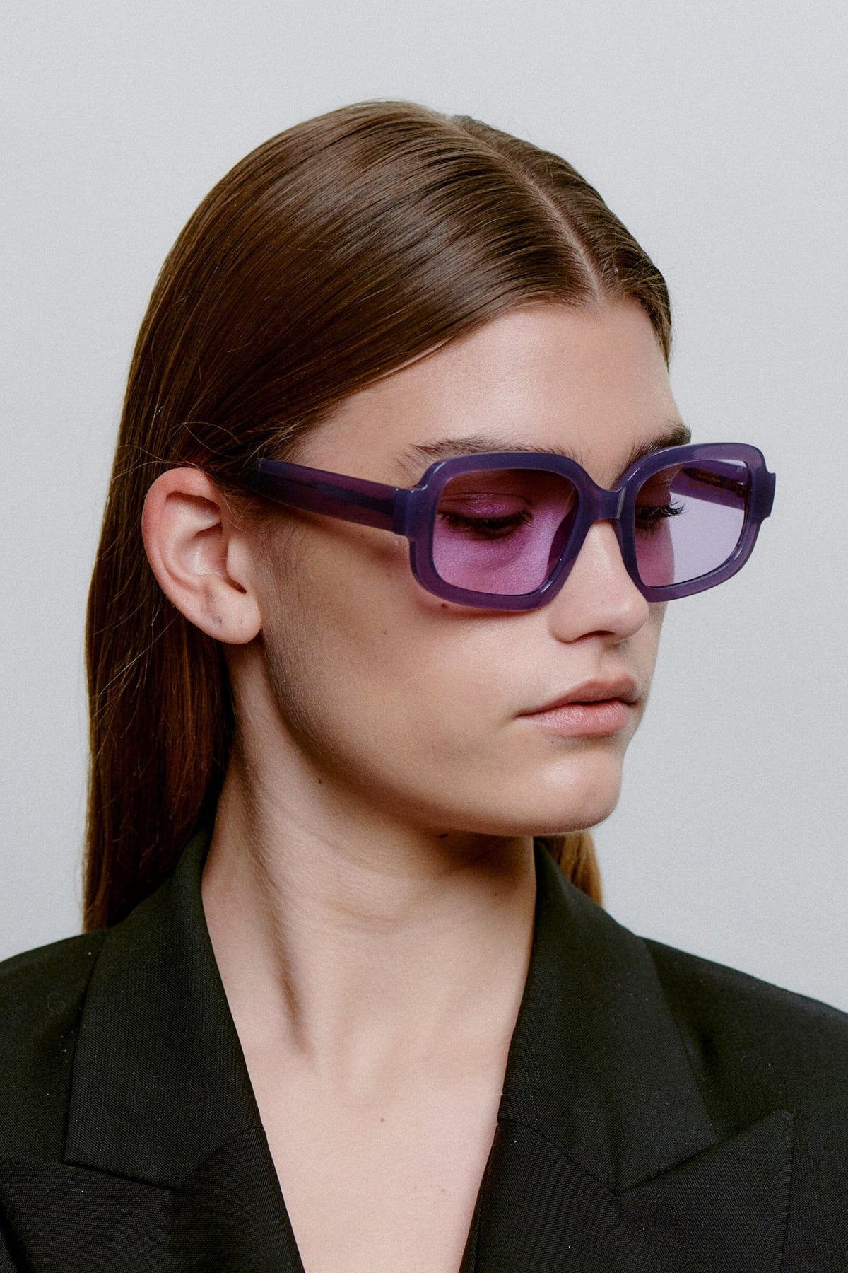 Sonnenbrillen von A. Kjærbede mit rechteckigem Rahmen in lila Nuancen. Der Rahmen hat eine kräftige Fassung mit getönten Gläsern und sanften Kurven im Design.
