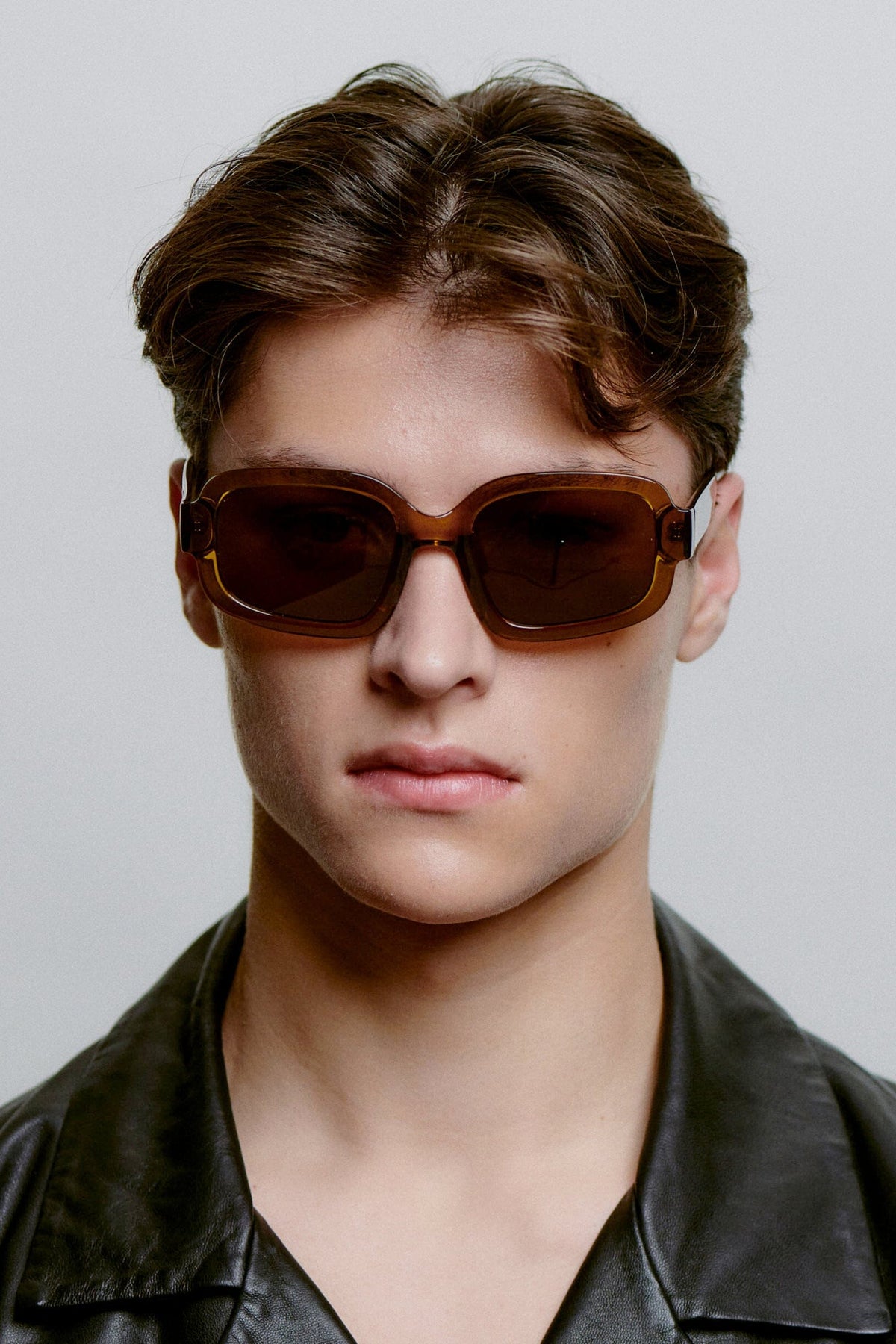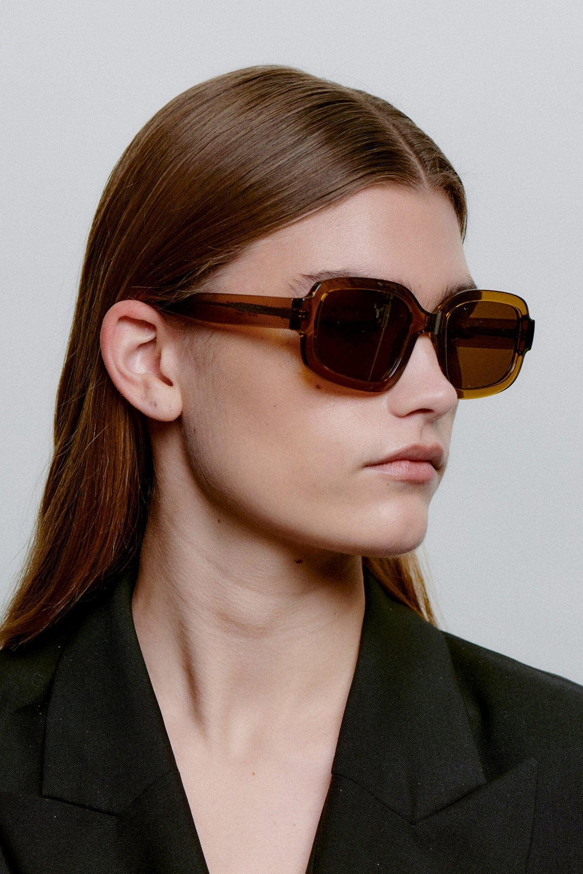 Übergroße Sonnenbrillen von A. Kjærbede mit kräftigem Rahmen in transparentem Braun. Die Sonnenbrillen haben eine rechteckige Form mit sanften Kurven und getönten Gläsern, die guten Schutz vor der Sonne bieten.