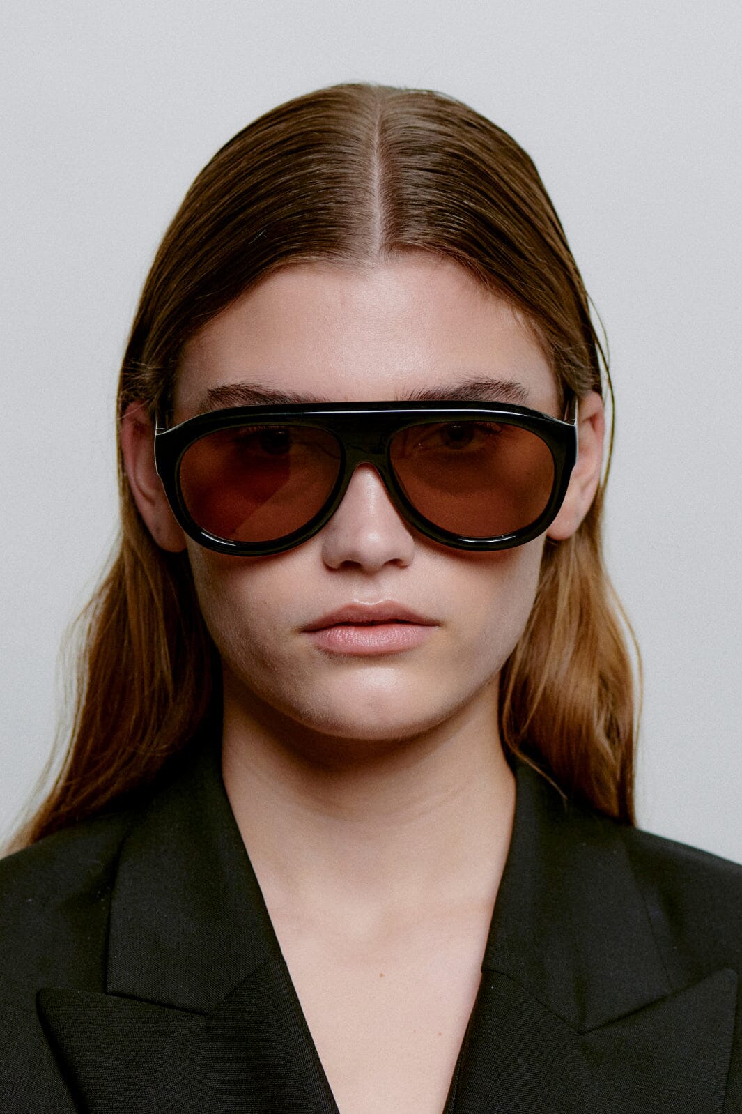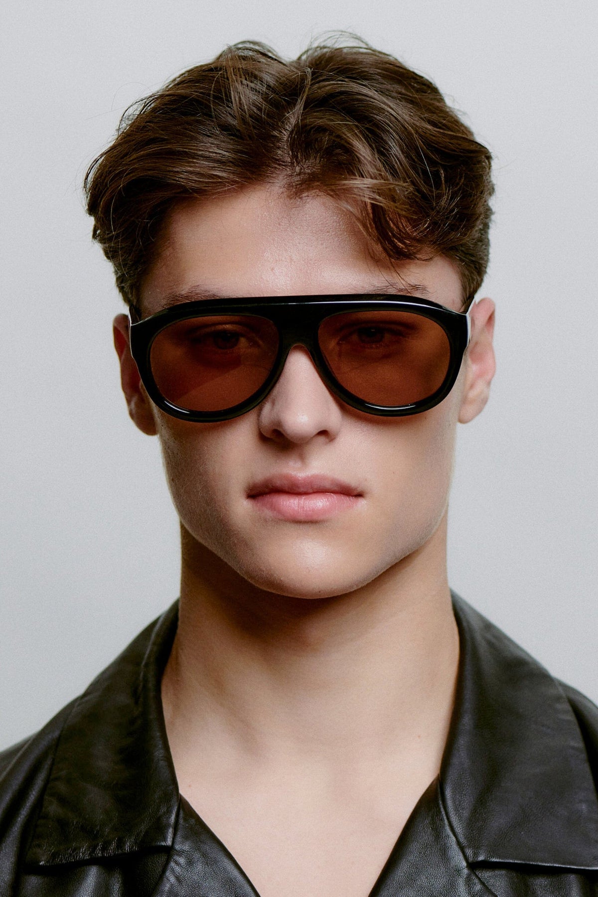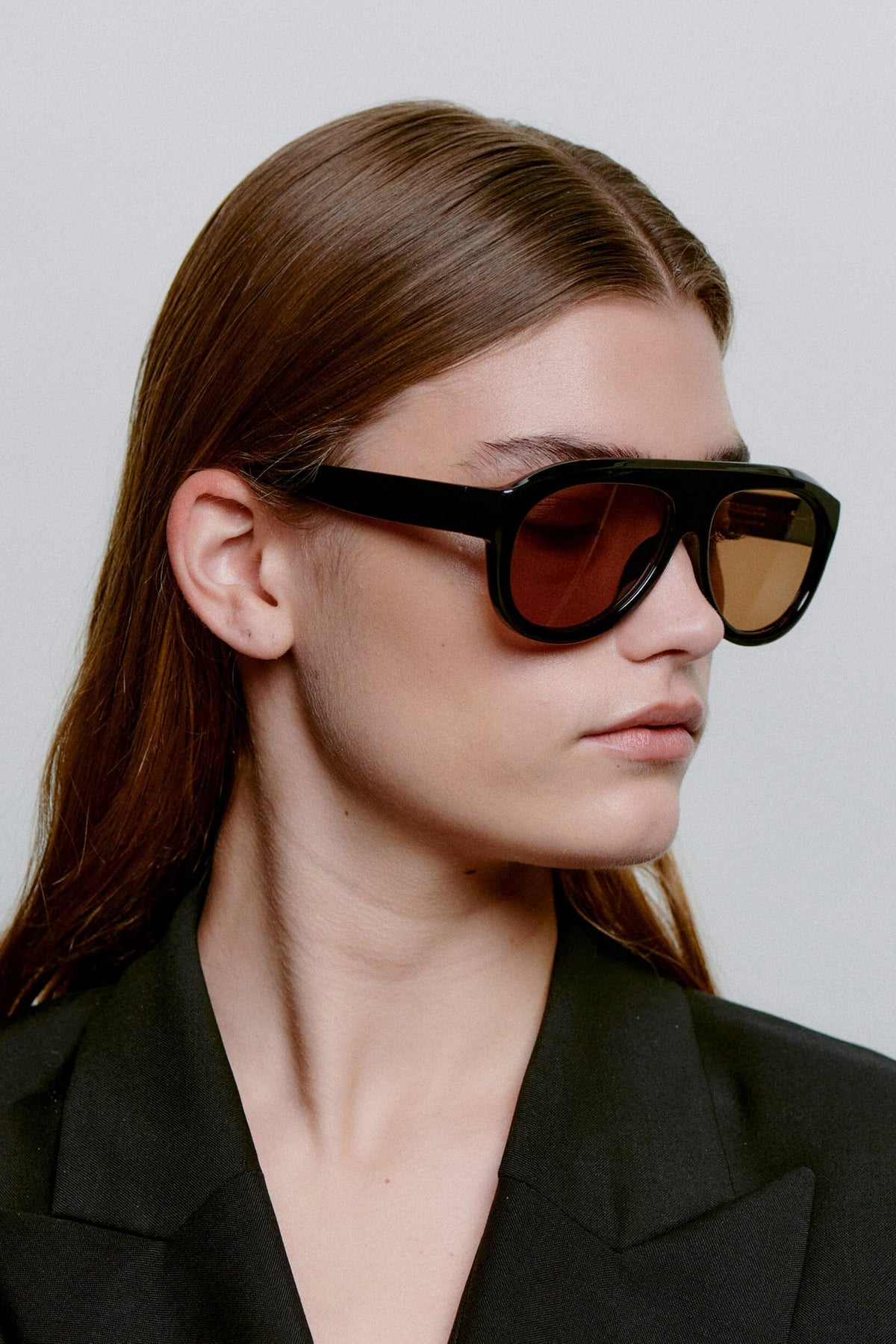 Schwarze Sonnenbrillen von A. Kjærbede mit aviator-inspirierter Fassung. Die Brillen haben eine breite, skulpturierte Form mit braunen Gläsern und einer markanten Brücke von 16 mm.