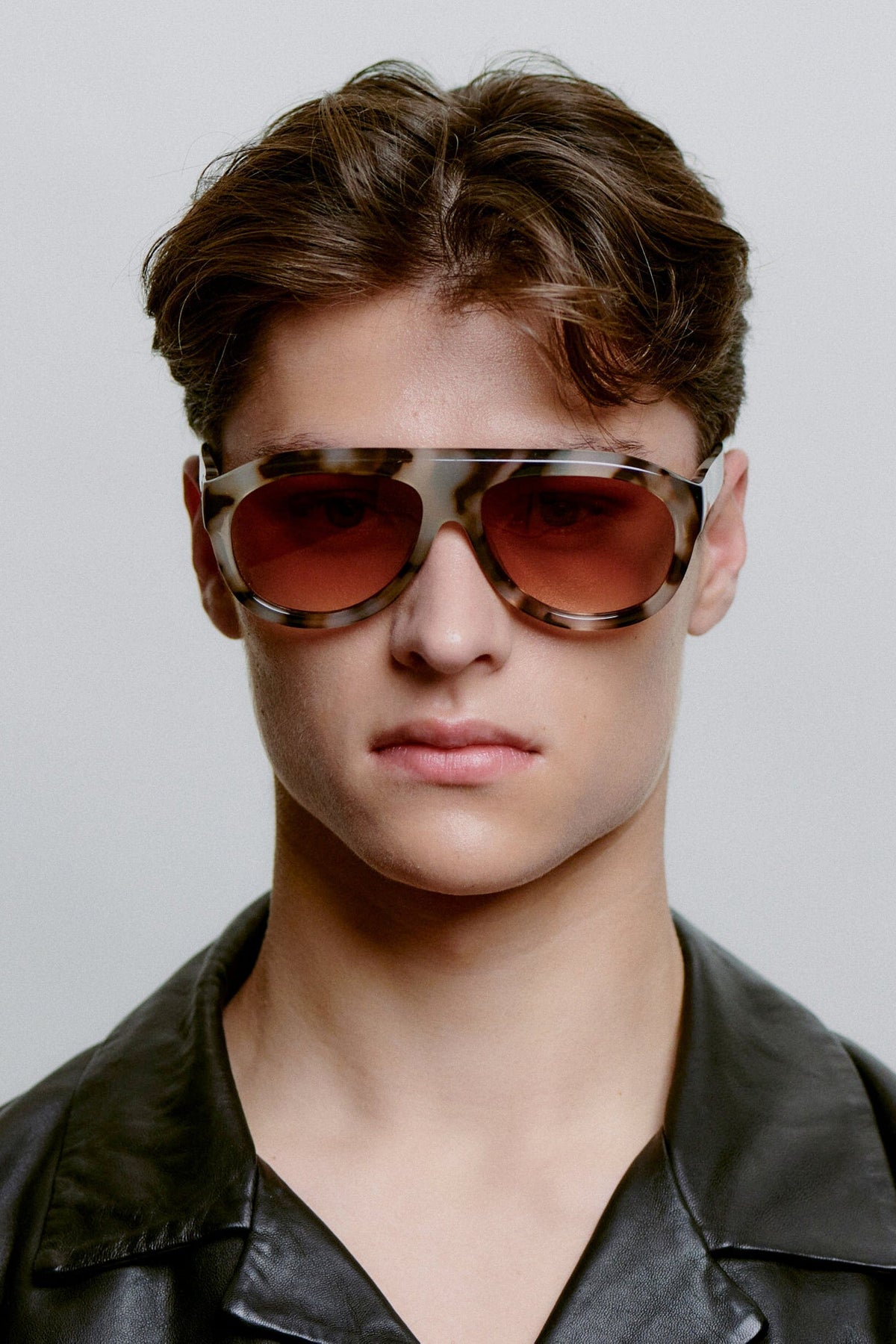 Sonnenbrillen von A. Kjærbede mit gemustertem Gestell in braunen und grauen Nuancen. Das Gestell hat eine Aviator-Form mit Verlaufsgläsern und einem charakteristischen Cookie Dough-Farbdessin.