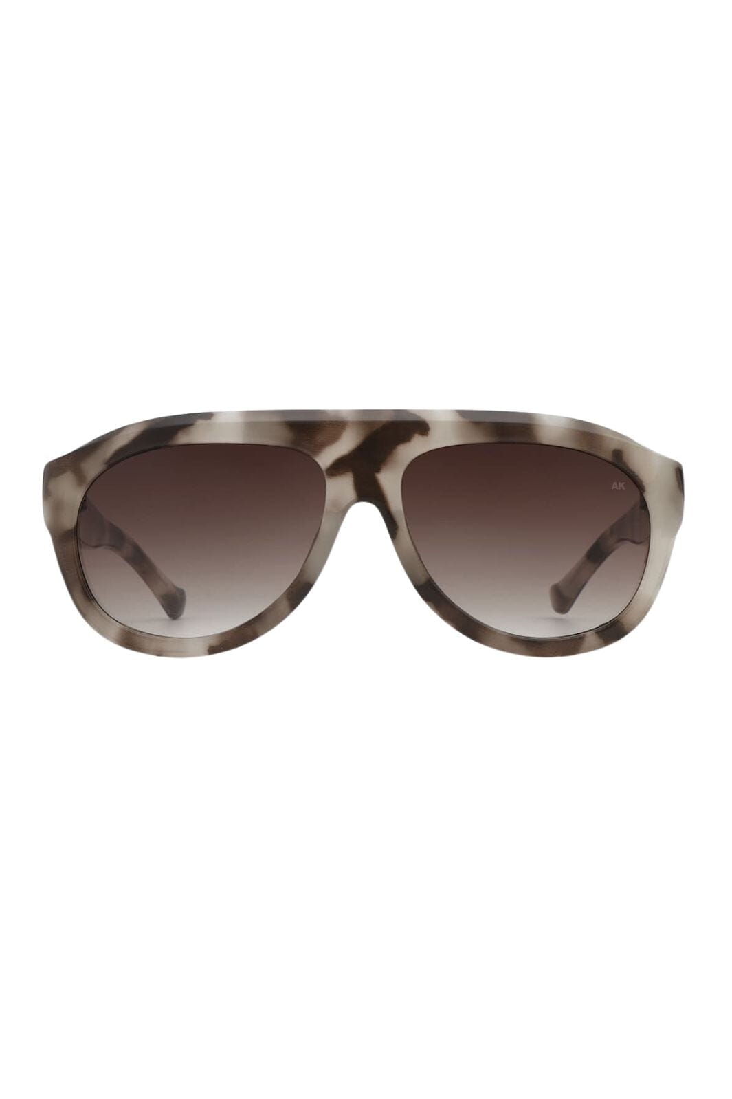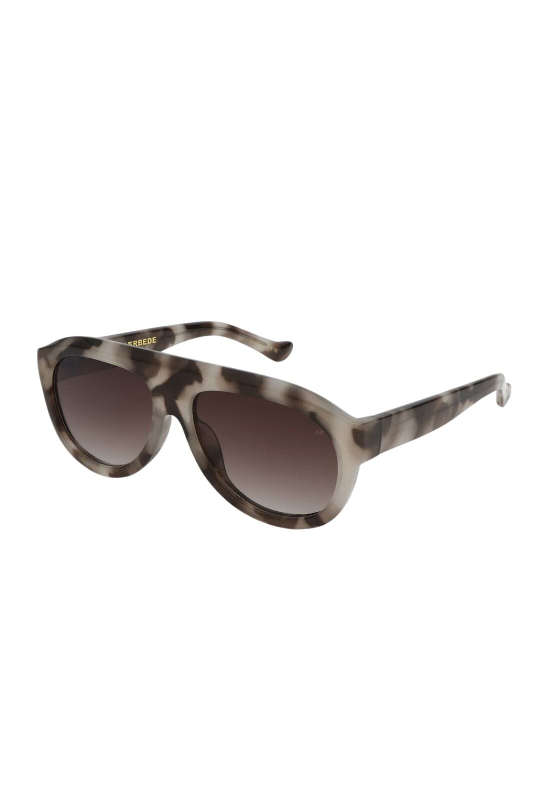Sonnenbrillen von A. Kjærbede mit gemustertem Gestell in braunen und grauen Nuancen. Das Gestell hat eine Aviator-Form mit Verlaufsgläsern und einem charakteristischen Cookie Dough-Farbdessin.