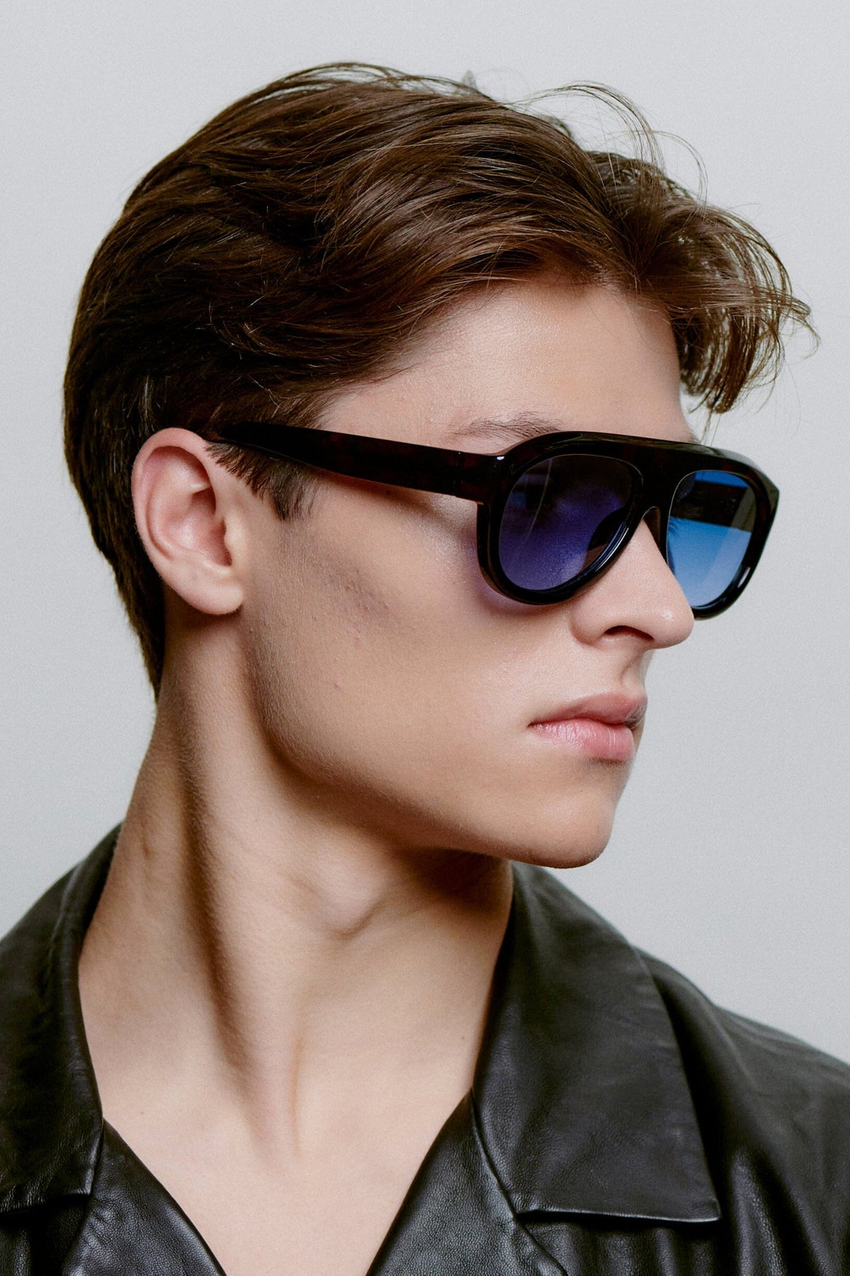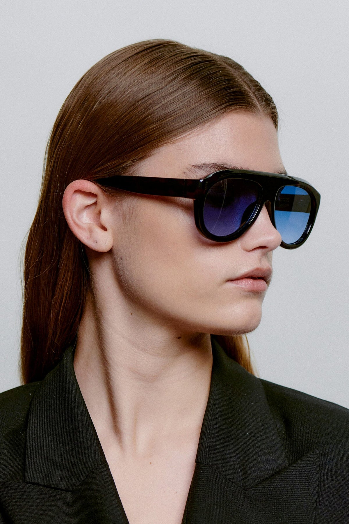 Sonnenbrillen von A. Kjærbede im Aviator-Design mit braunem Demi Tortoise-Rahmen und blaufärbigen Gläsern. Der Rahmen hat eine große, skulpturale Form mit markanten Linien.