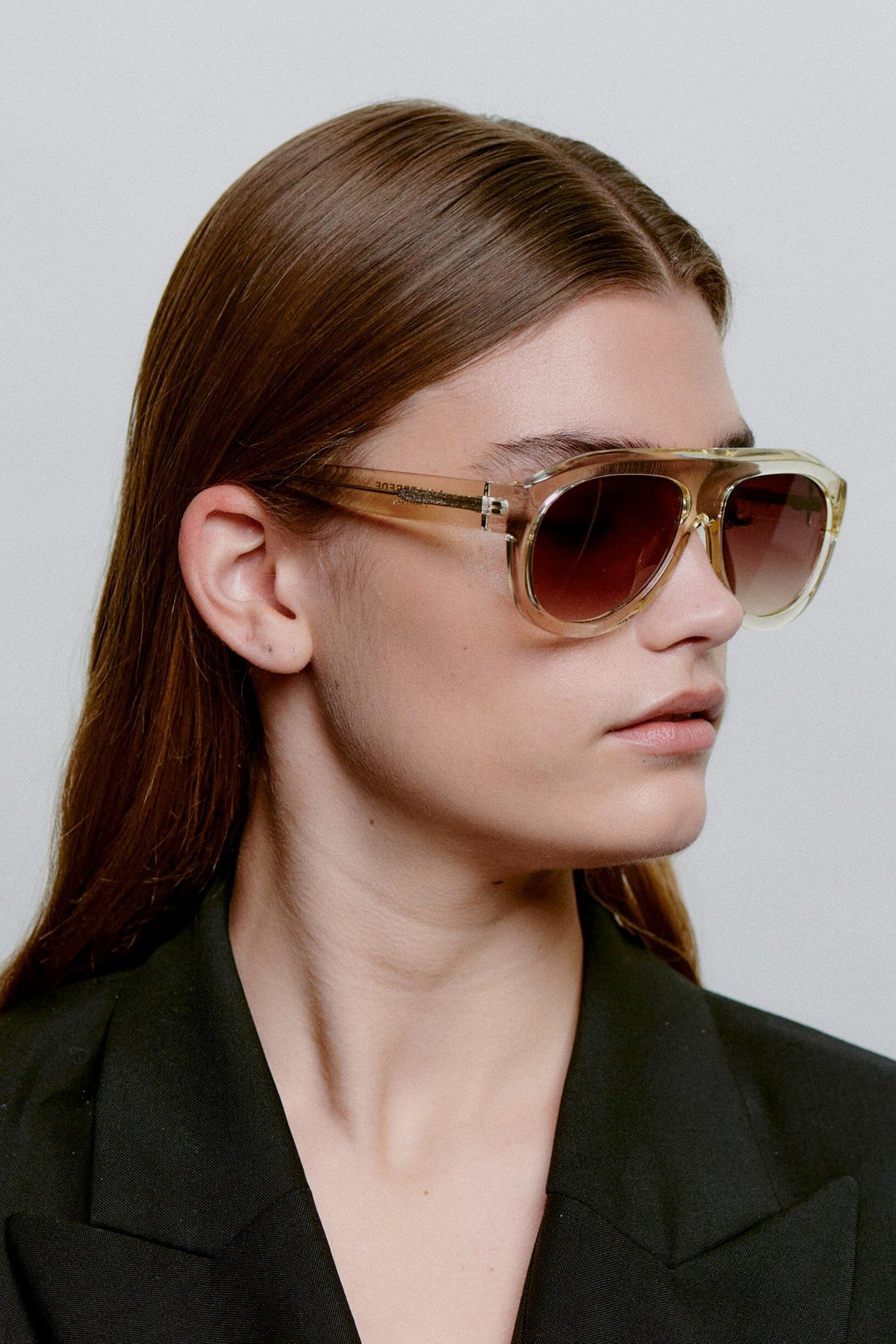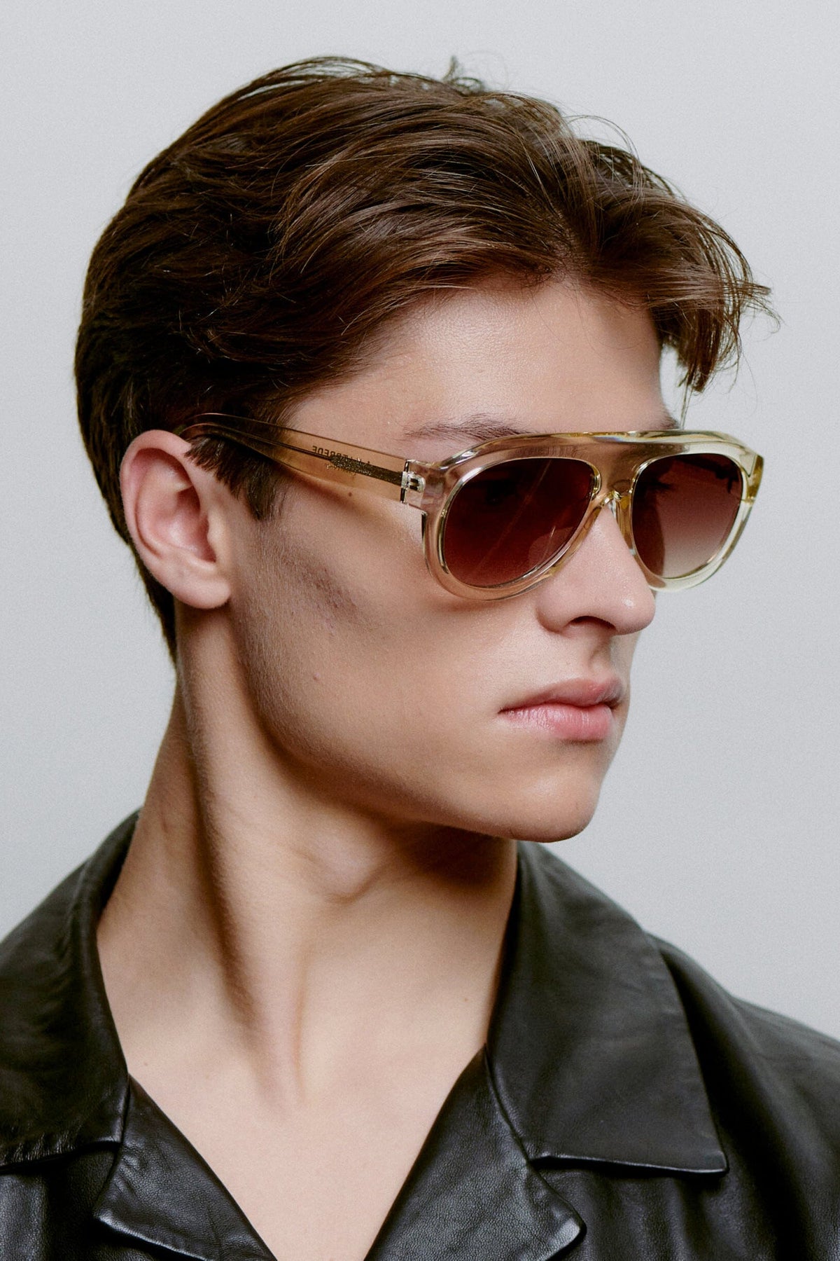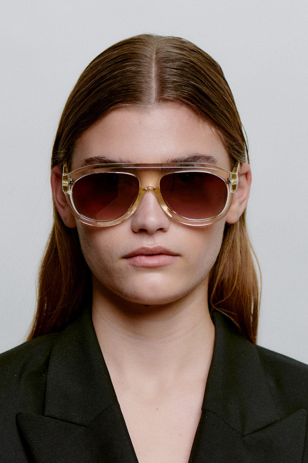 Sonnenbrillen von A. Kjærbede in transparentem Ecru. Das Aviator-Design hat einen skulpturierten Rahmen mit graduierenden Gläsern, die oben dunkler und unten heller sind.