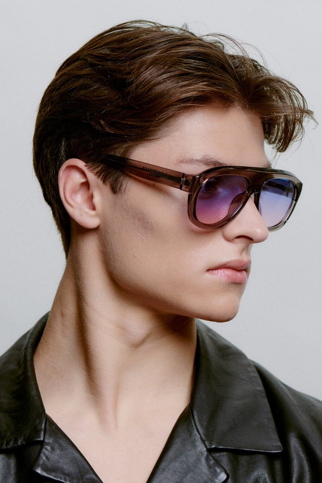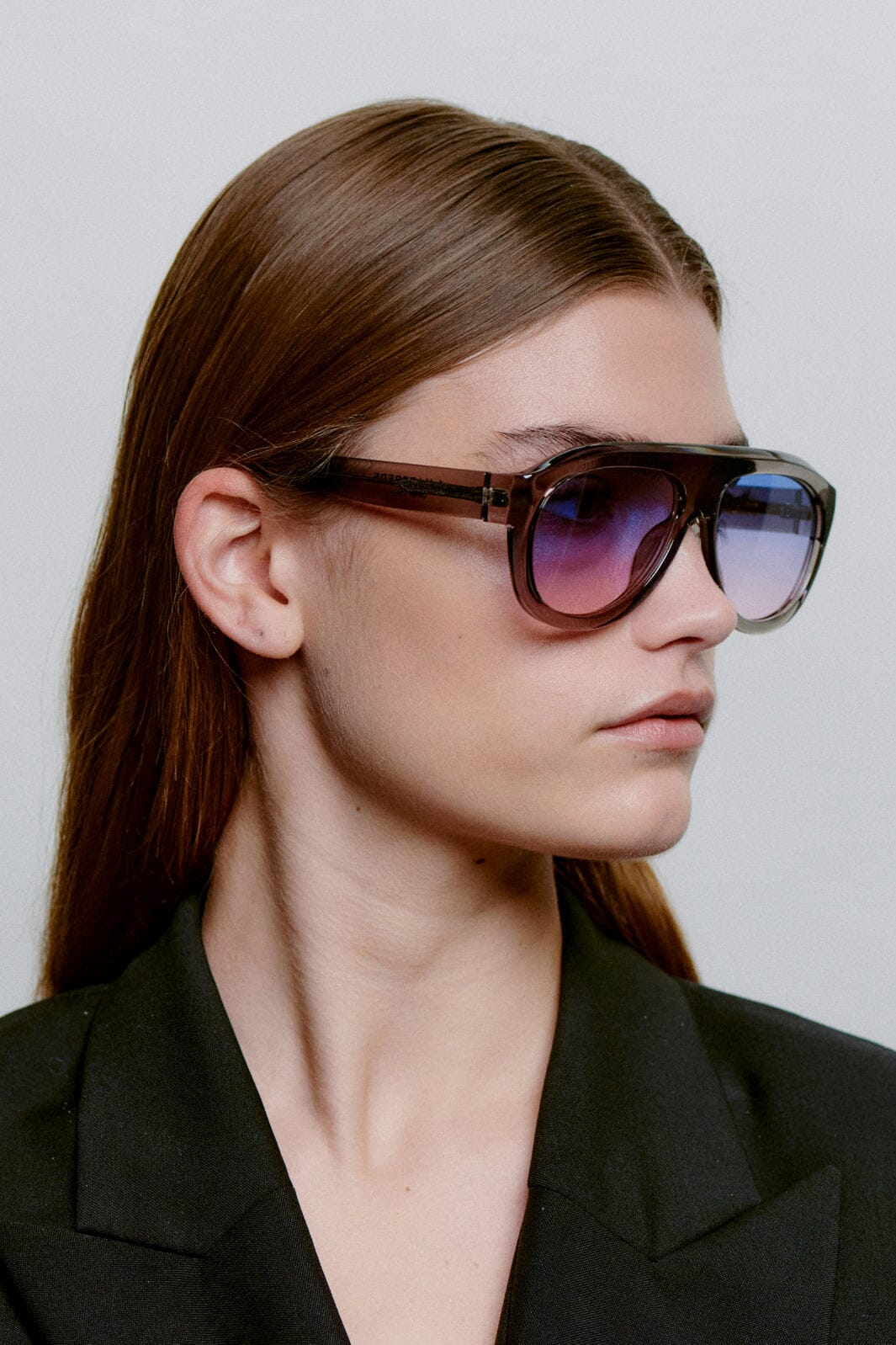 Sonnenbrillen von A. Kjærbede mit grauem, transparentem Gestell und gradientfarbigen Gläsern von Blau bis zu hellen Nuancen. Ein übergroßes Aviator-Modell mit einer breiten Brücke von 16 mm.