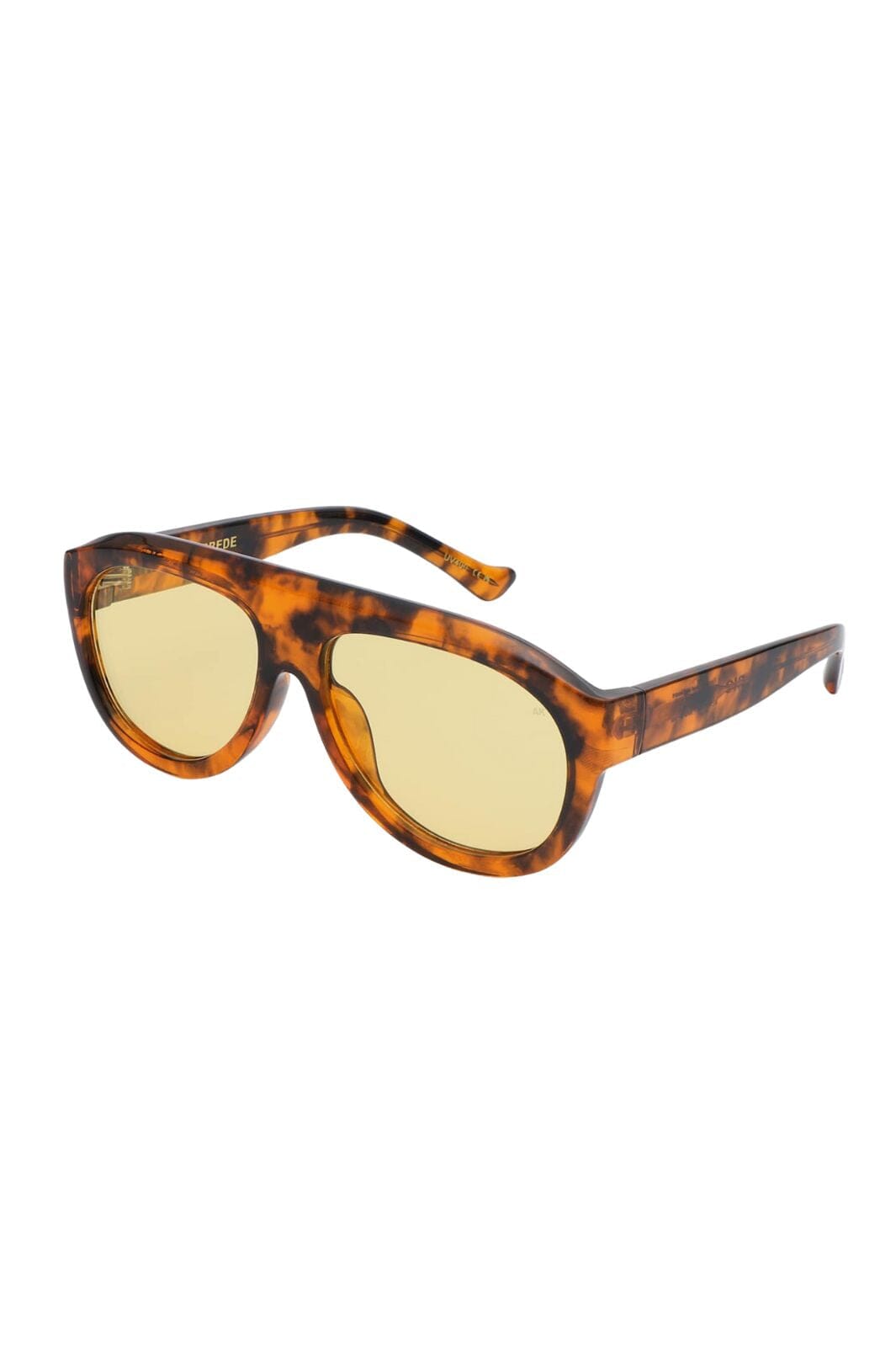 Sonnenbrillen von A. Kjærbede mit orange, braun und gelb Farbkombination. Das Gestell hat eine breite Oberkante und ein charakteristisches Schildpatt-Muster mit gelben Gläsern.