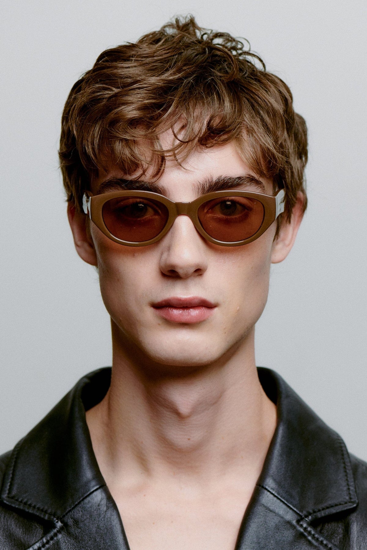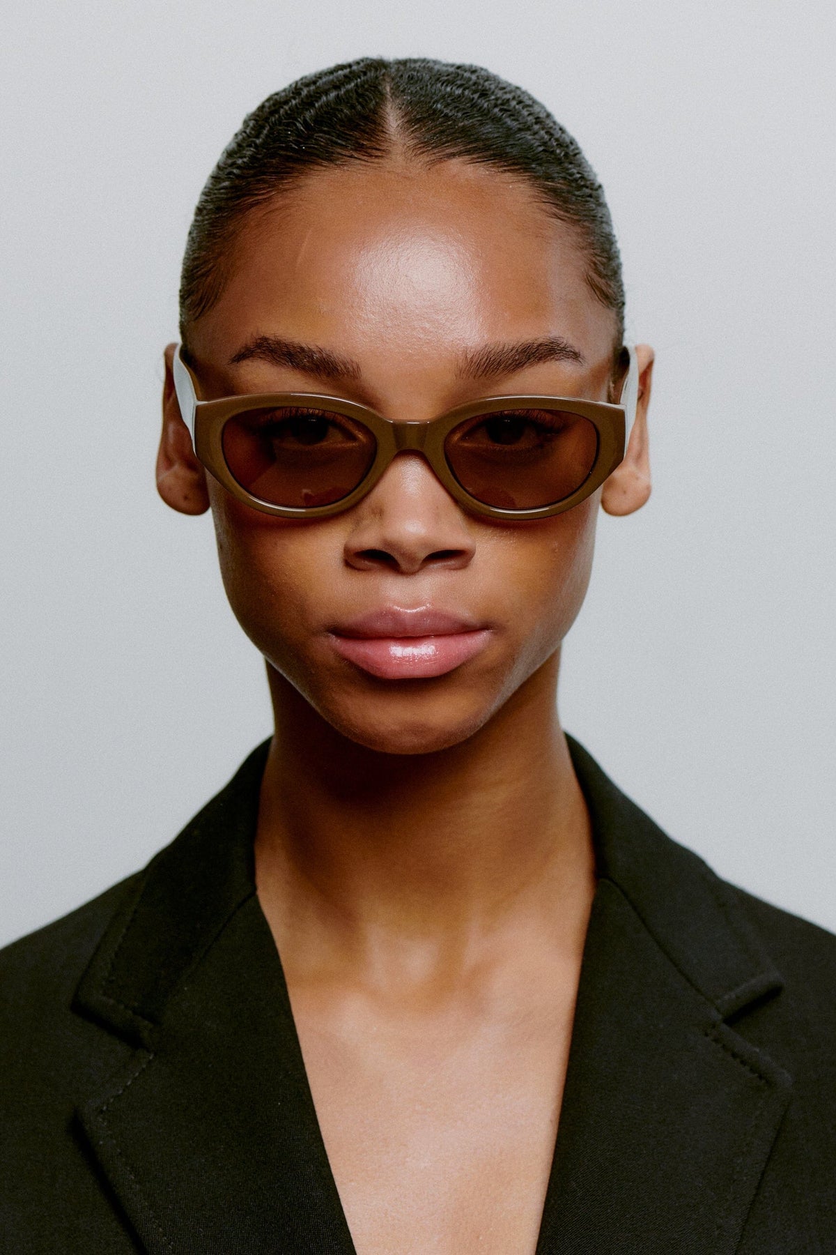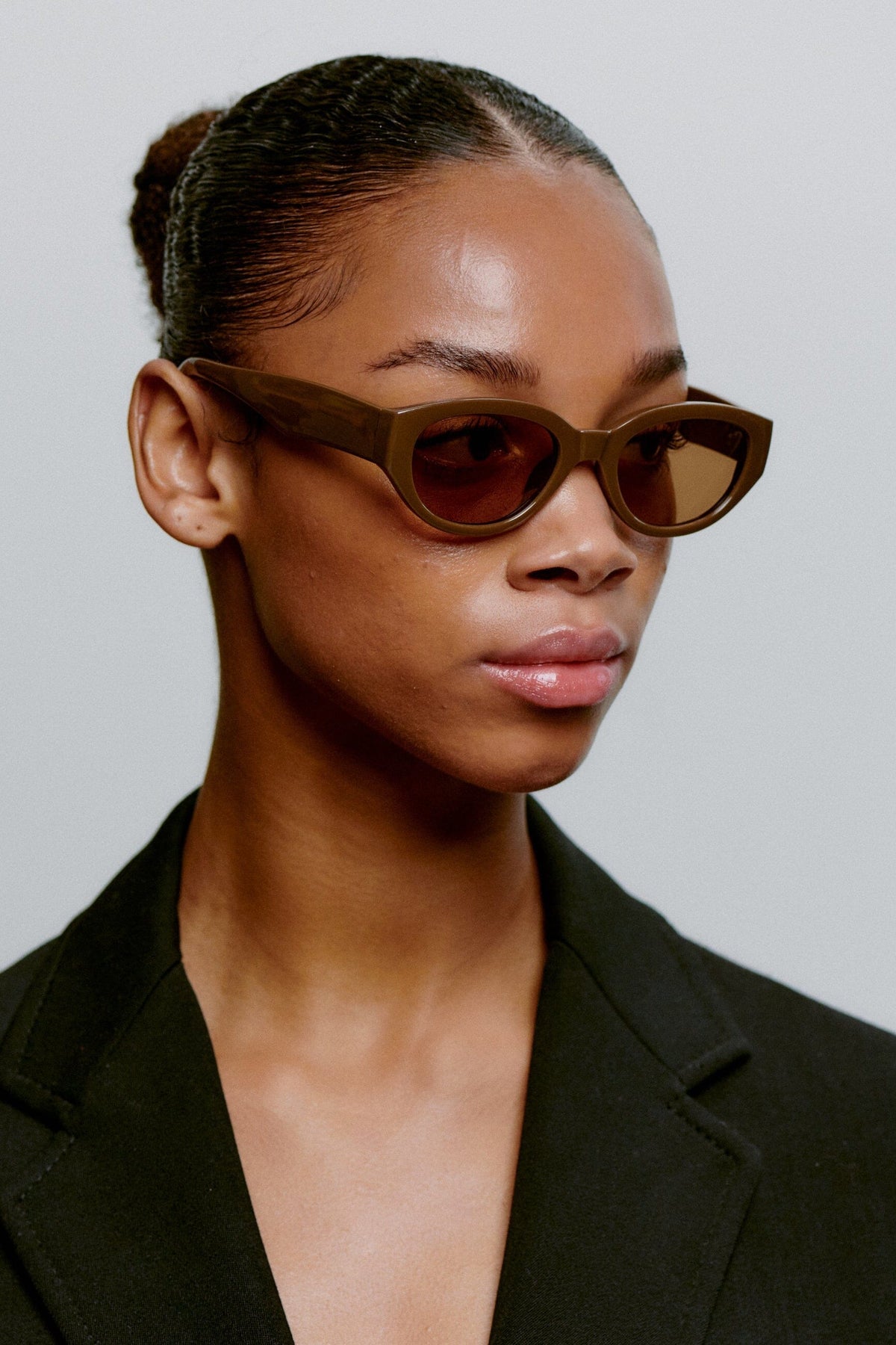 Braune Sonnenbrillen von A. Kjærbede mit Cat-Eye-Form. Das Gestell hat ein dickes Design aus dunkelbraunem Tritan Renew-Material mit formbaren Bügeln und hochwertigen optischen Scharnieren.