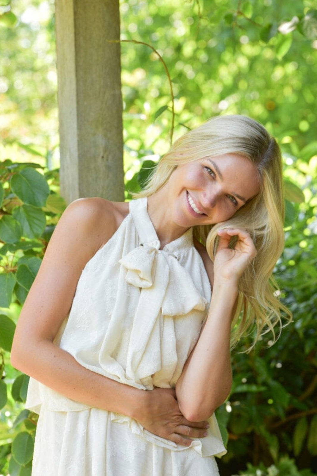 Kleid von A-View in hellem Sand mit Rüschen, Schleifen und Bindedetails. Das Kleid ist ärmellos mit hohem Halsausschnitt und knielang.