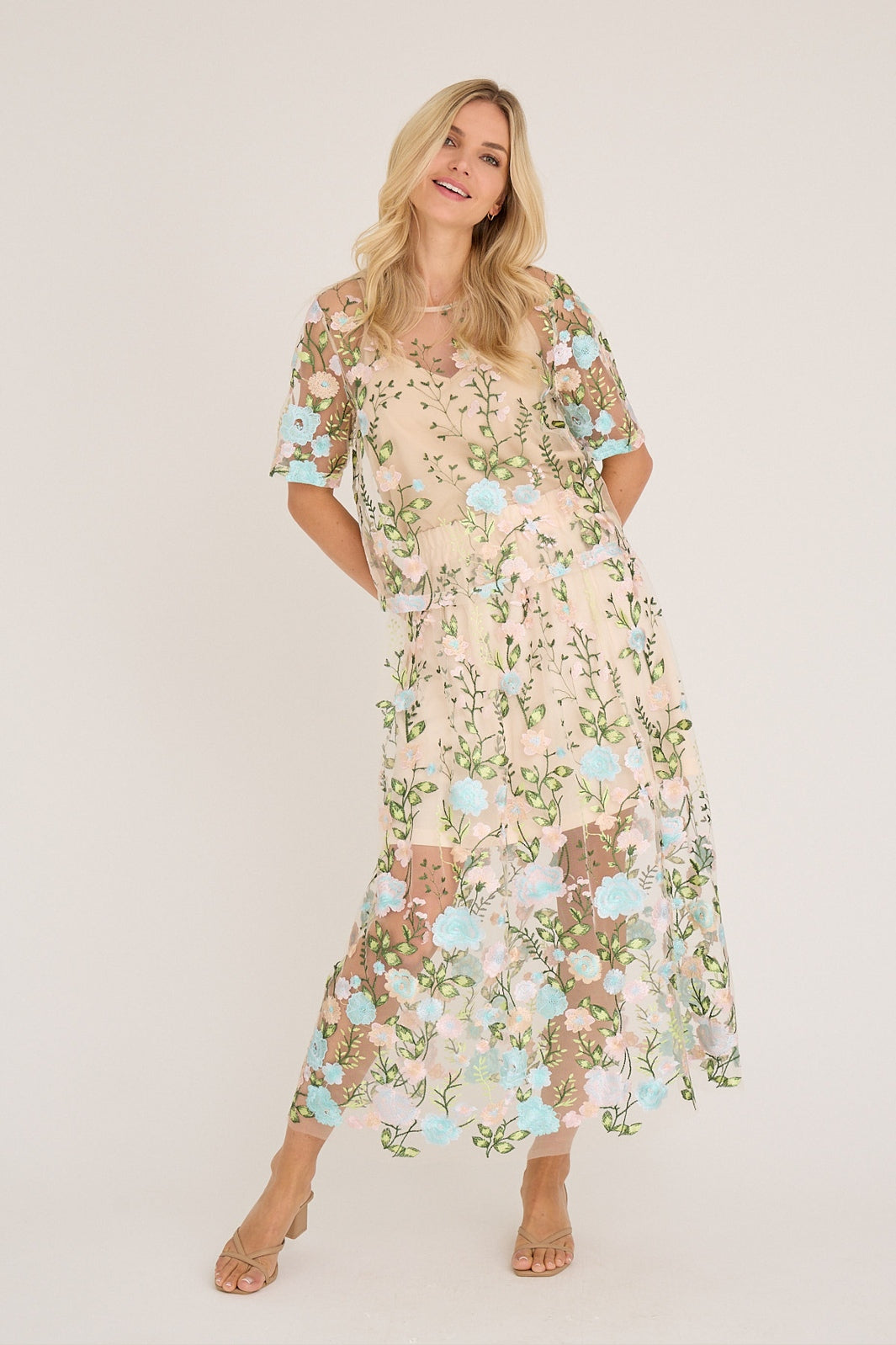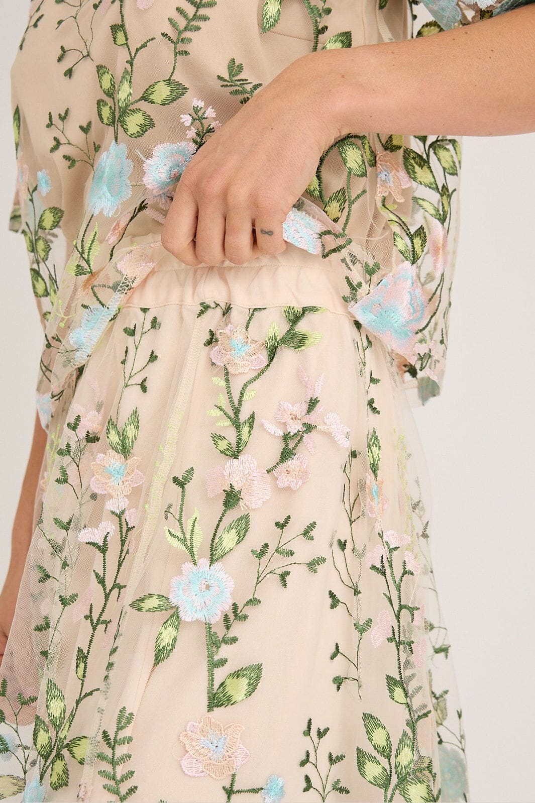 Langer Rock von A-View aus transparentem Mesh mit Blumenstickerei in Rosa, Hellblau, Beige und Grüntönen.