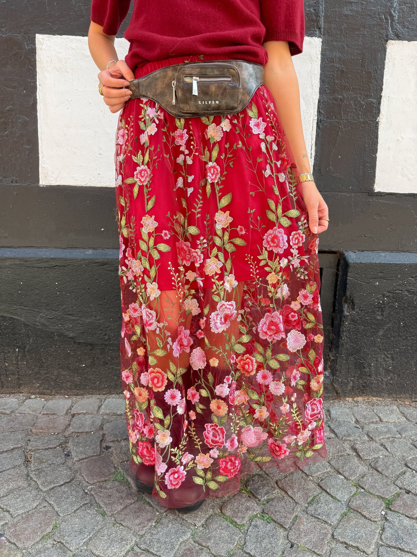 Lange Rock von A-View in Bordeaux- und Rosatönen. Der Rock hat eine durchsichtige Schicht mit bestickten Blumen und wird mit einem kurzen Unterrock in Bordeaux geliefert.