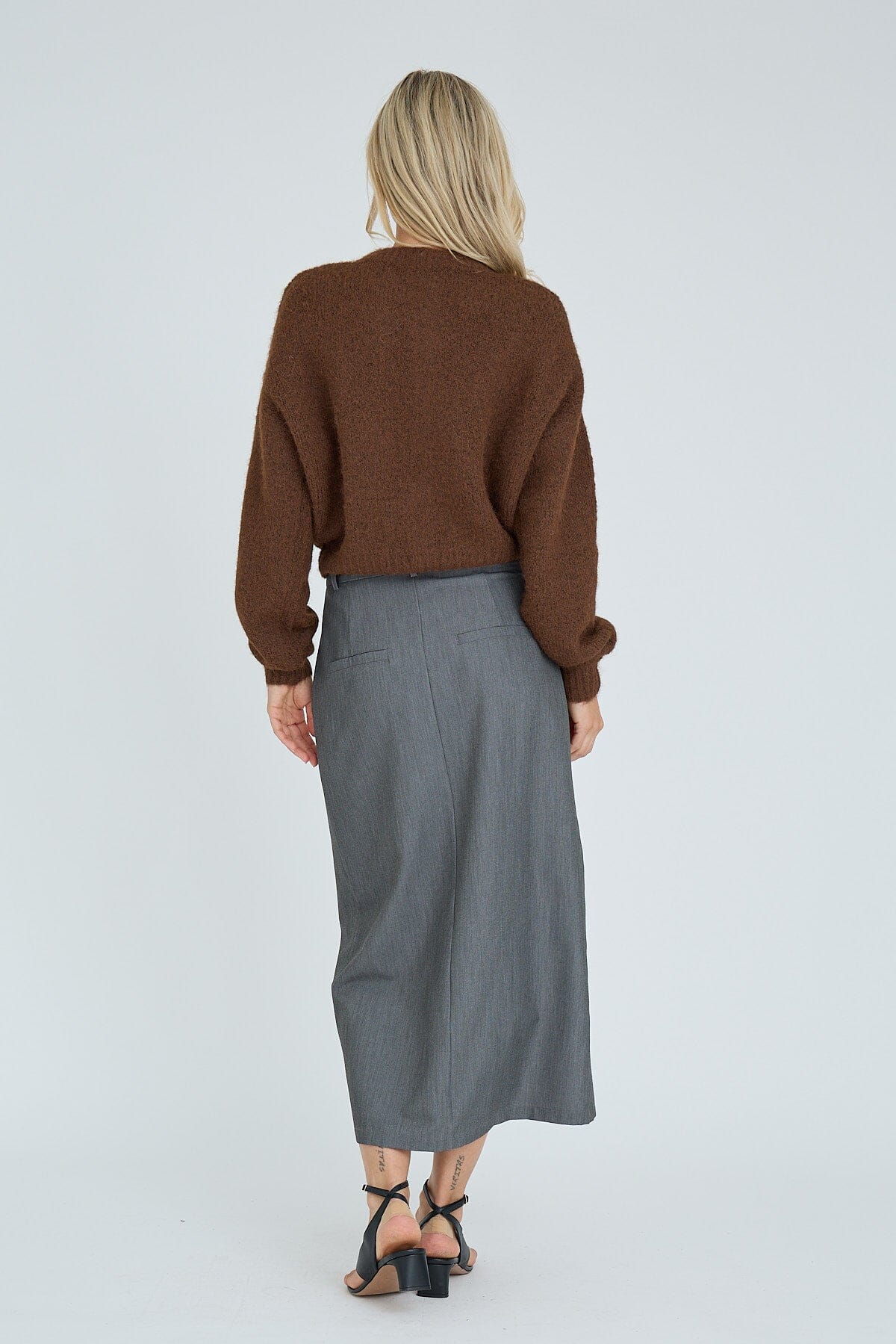 Braune Strick-Cardigan von A-View mit Perlendetails. Die Cardigan hat einen Knopfverschluss mit hellen Knöpfen, lange Ärmel und einen Rundhalsausschnitt.