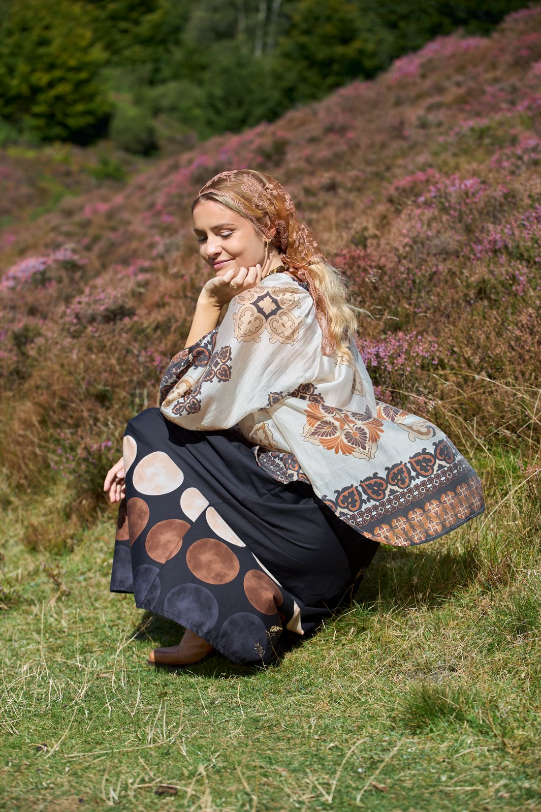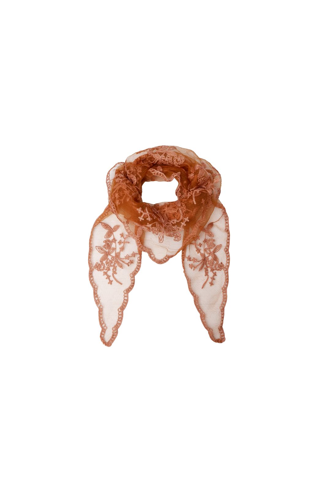 Dreieckstuch von Black Colour in tabakfarbener Nuance. Das Tuch hat ein transparentes Spitzenmaterial mit Blumenstickerei über die gesamte Fläche.