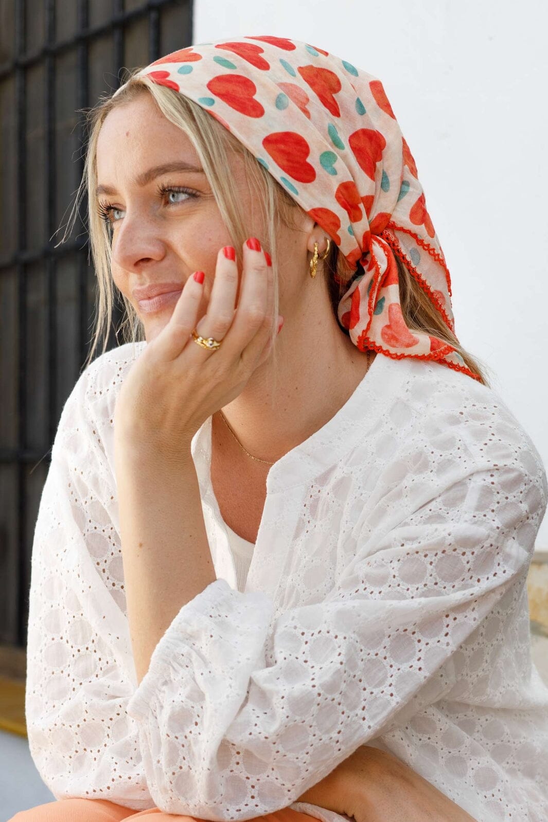 Mini-Schal von Black Colour aus weißer Baumwolle mit roten Herzen und blauen Blättern. Der dekorative Rand verleiht dem Schal eine schöne Note.