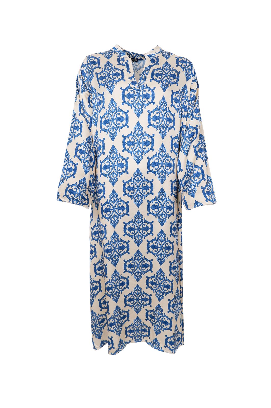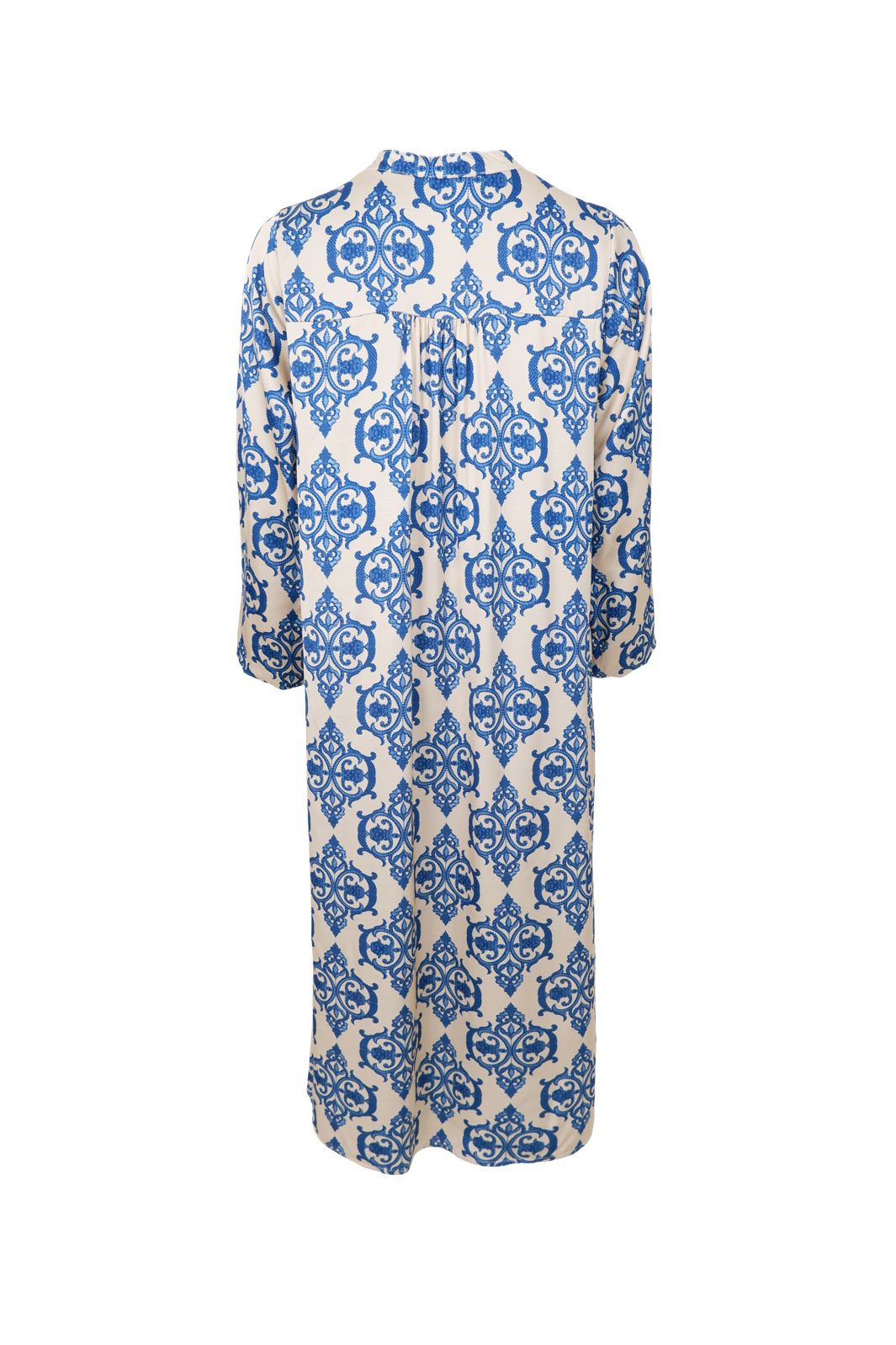 Satinkleid von Black Colour mit blauem Muster auf offwhitefarbenem Hintergrund. Das Kleid besteht aus 100 % Viskose und hat einen V-Ausschnitt sowie dreiviertellange Ärmel.