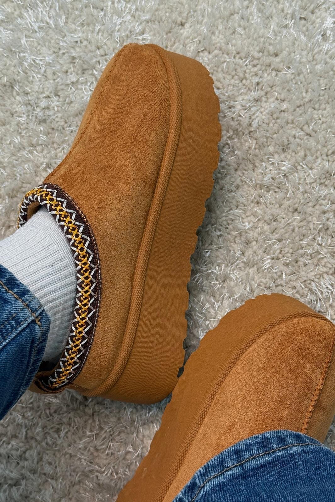 Hausschuhe von Bloom mit Keilabsatz in einem warmen Braunton. Hergestellt aus 100 % synthetischem Material mit runder Zehenform.