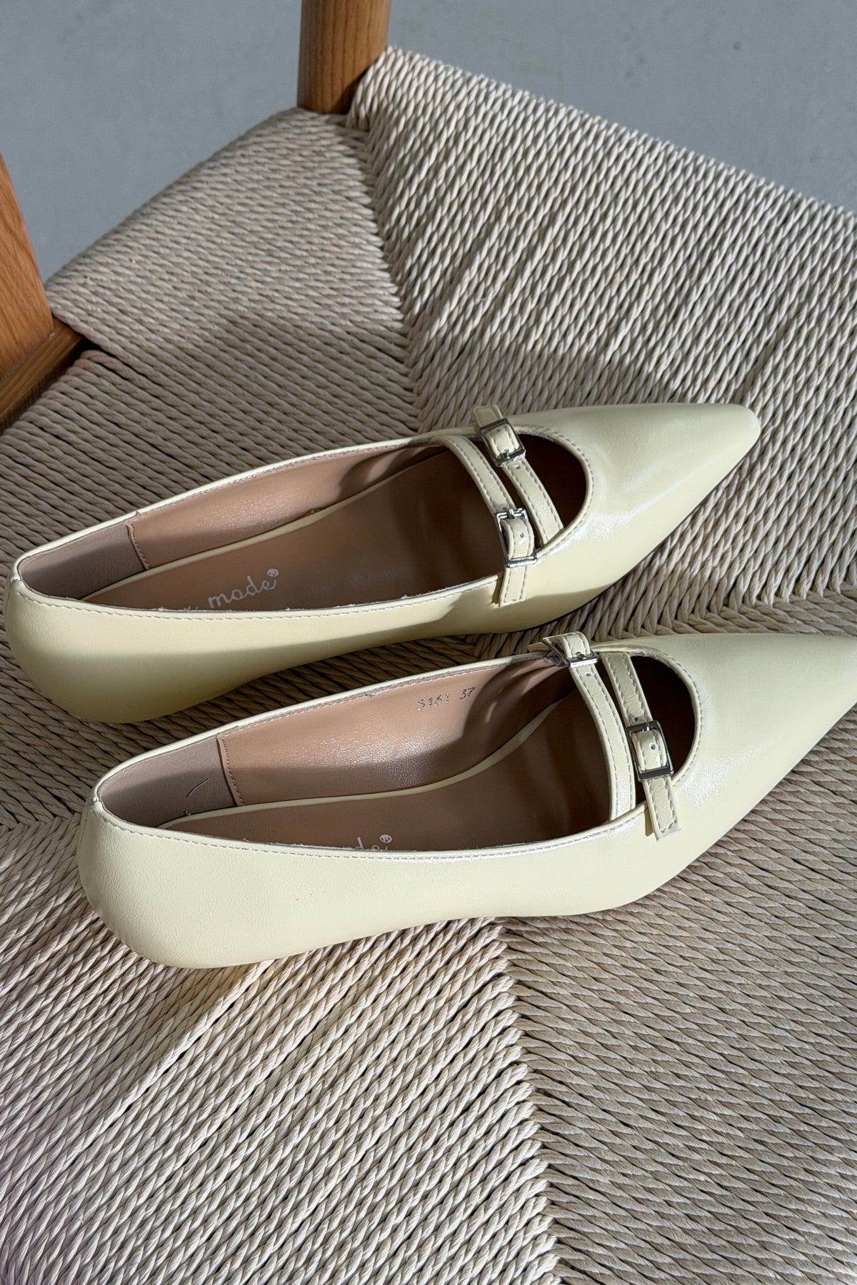 Hellgelbe Ballerinas von Bloom mit spitzer Zehenpartie und einem dekorativen Riemen mit Schnalle. Die Schuhe bestehen aus synthetischem Material.