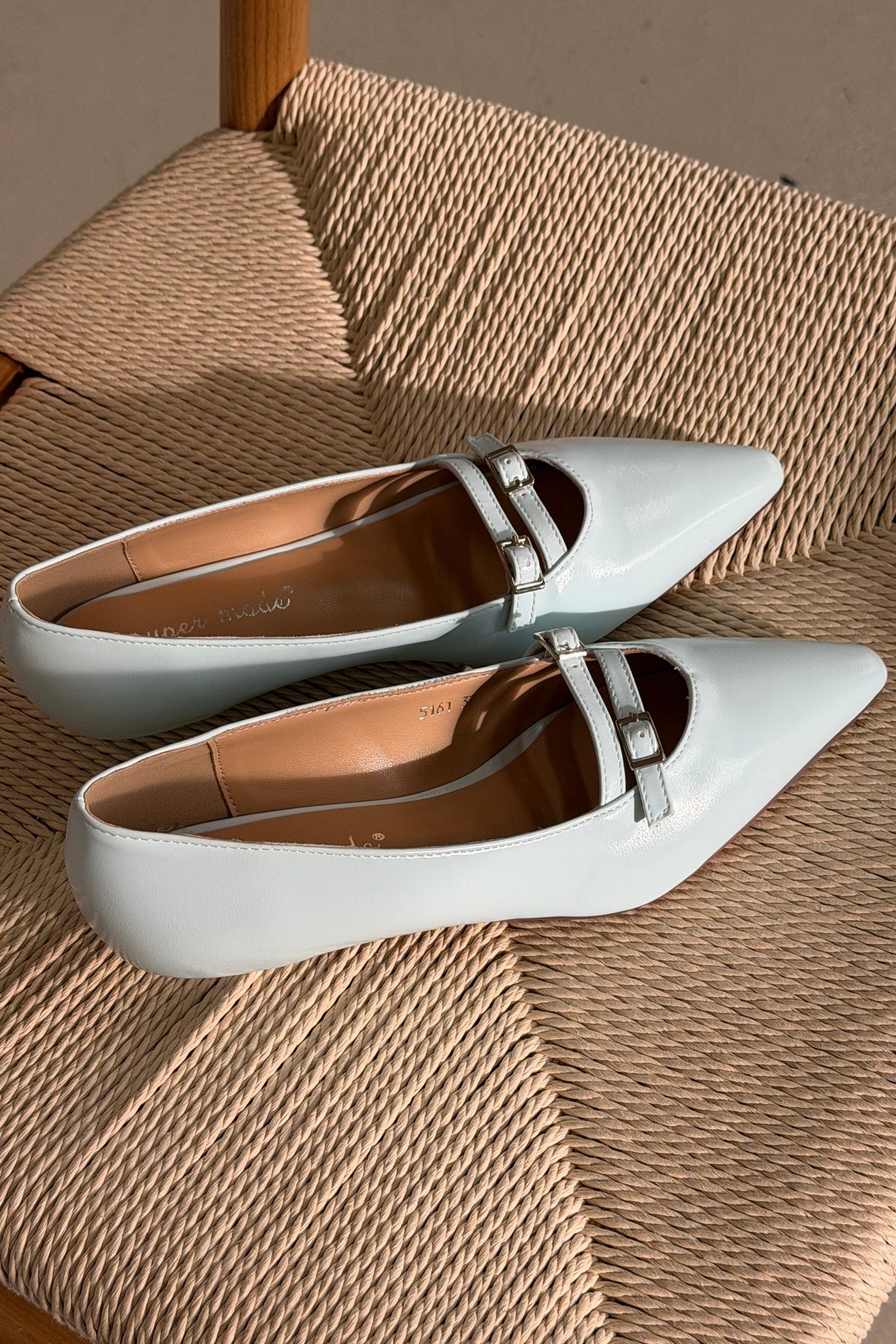 Hellblaue Ballerinas von Bloom aus synthetischem Material. Die Schuhe haben spitze Zehenpartien und flache Absätze.