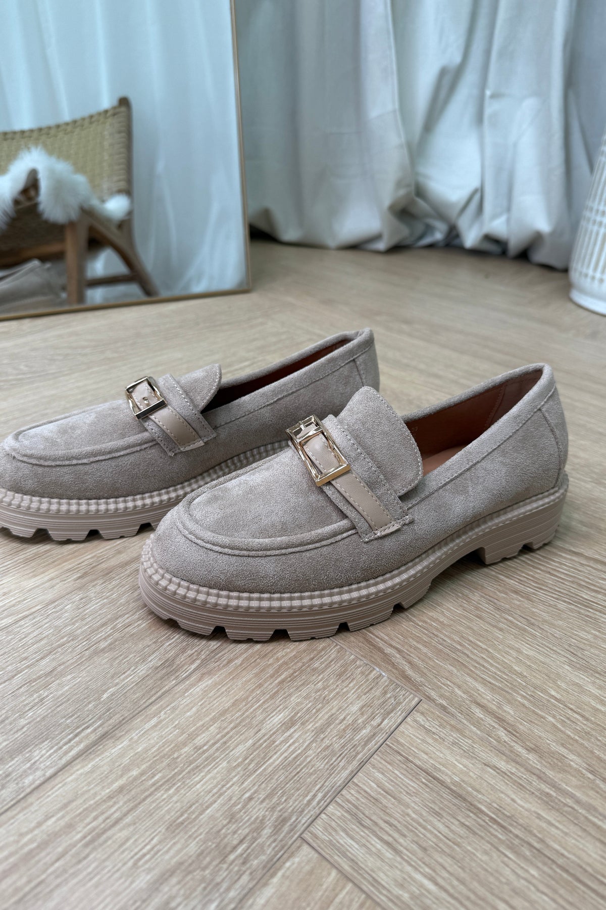 Beige Loafer von Bloom aus Textil. Die Schuhe haben einen Blockabsatz und eine Metallschnalle vorn, die einen klassischen Loafer-Look verleiht.