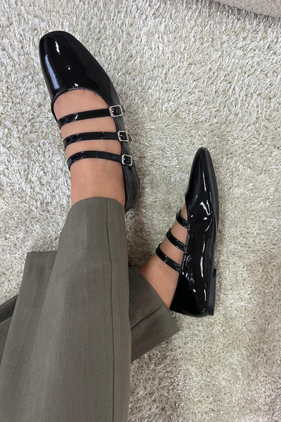 Schwarze Lackschuhe mit drei Schnallen von Bloom. Die spitze Zehe und die schmalen Riemen verleihen dem Schuh einen klassischen Ausdruck, der sowohl zu festlichen als auch zu formellen Anlässen passt.