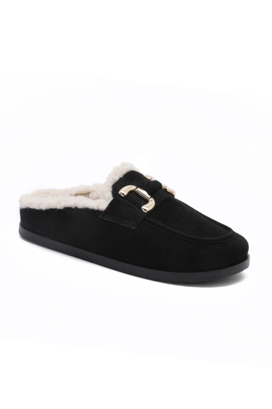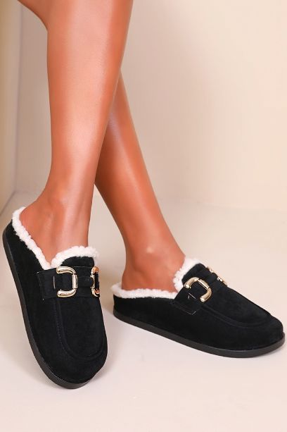 Schwarze Hausschuhe von Bloom mit weißem Futter und metallischen Schnallen. Die Hausschuhe haben eine flache Sohle und sind für bequemen Gebrauch zu Hause konzipiert.