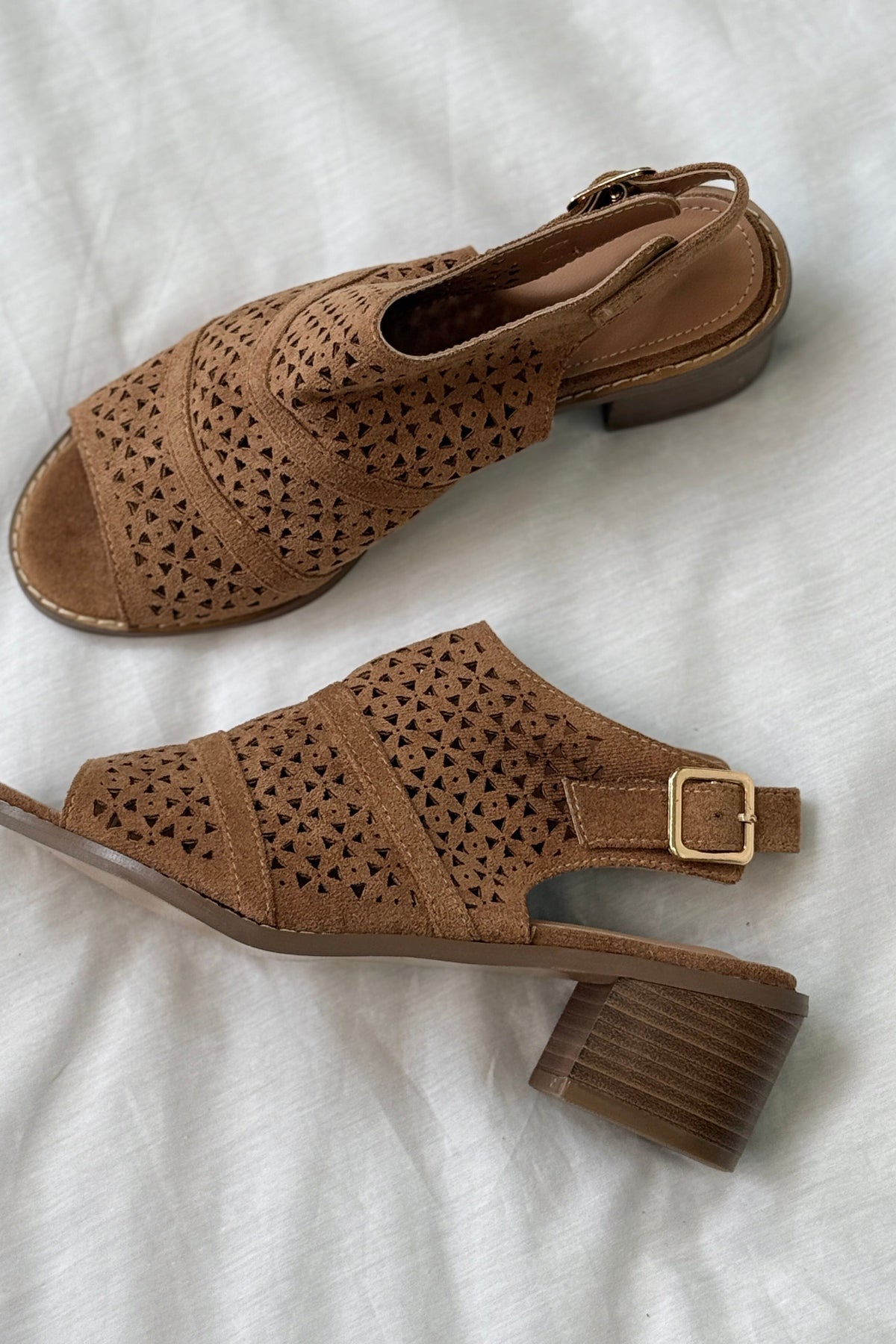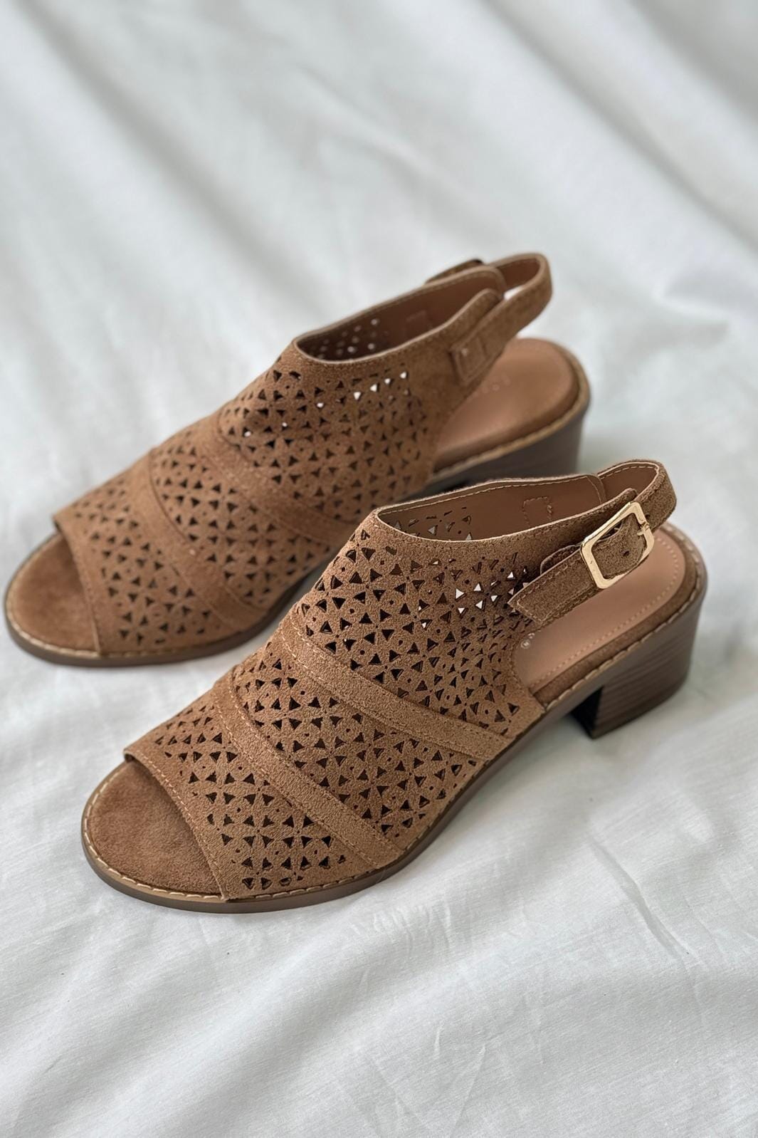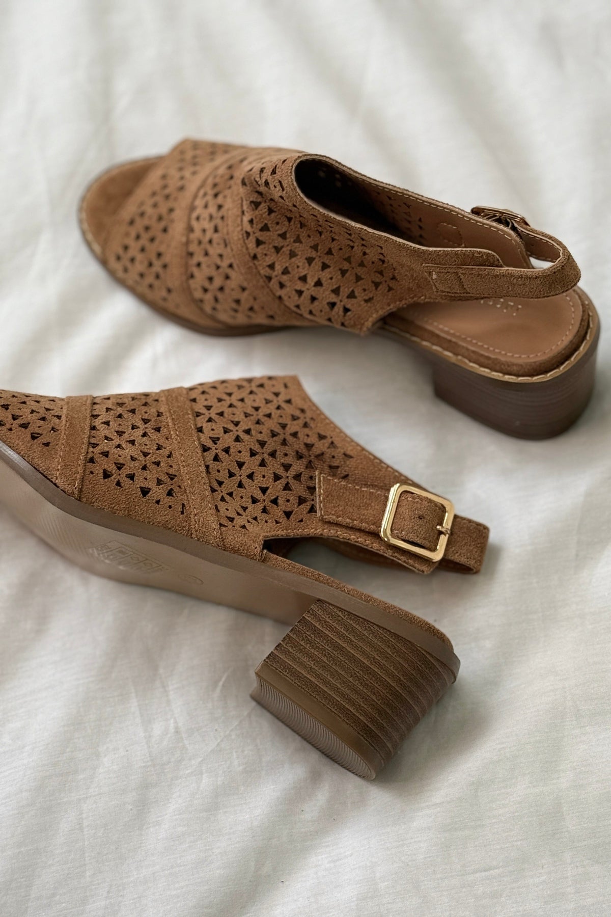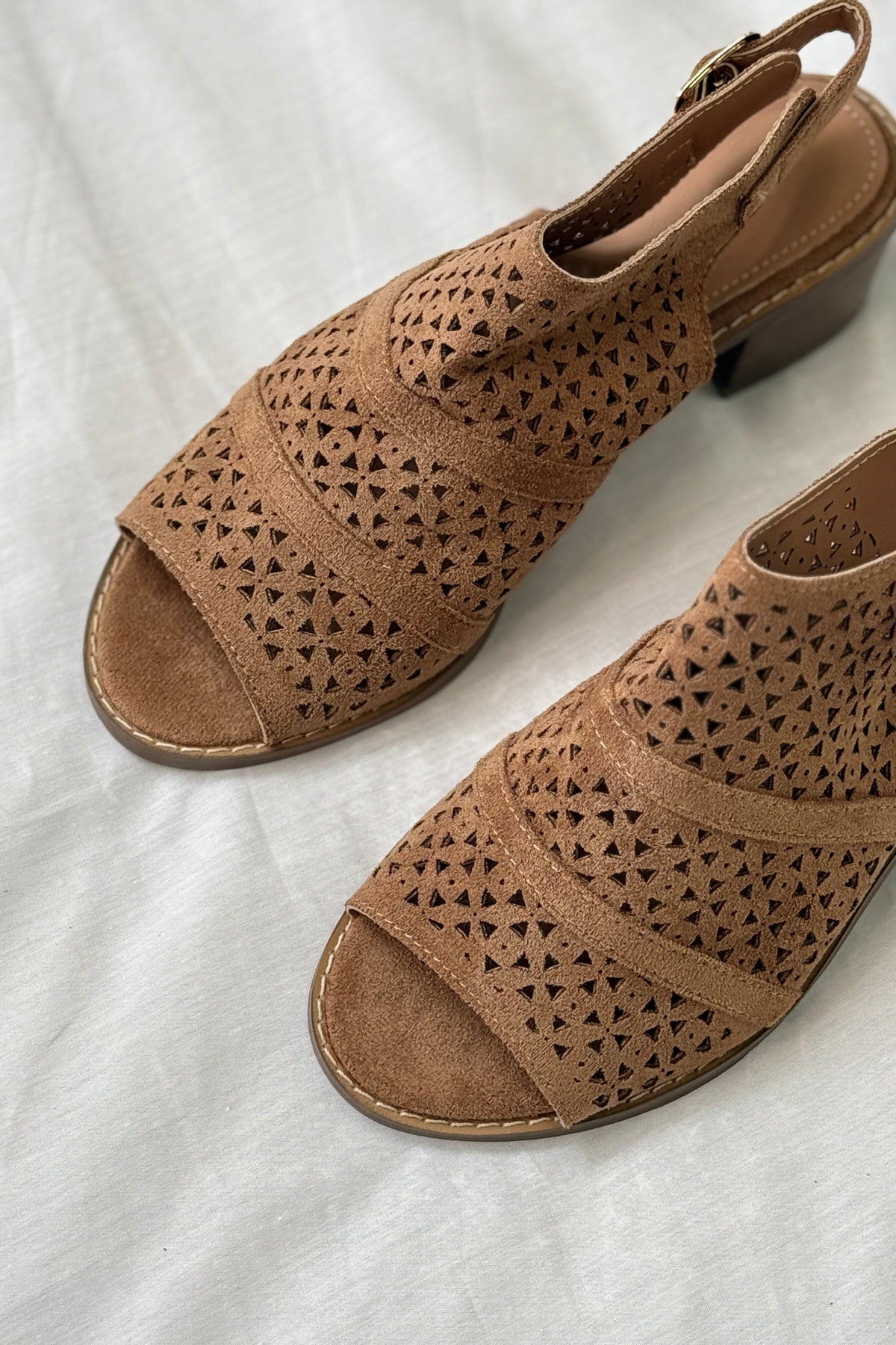 Sandal von Bloom in camel-Farbe mit ausgeschnittenem geometrischem Muster. Sie hat einen praktischen Blockabsatz und einen verstellbaren Riemen hinten, der sie sowohl für den Alltag als auch für Feste geeignet macht.