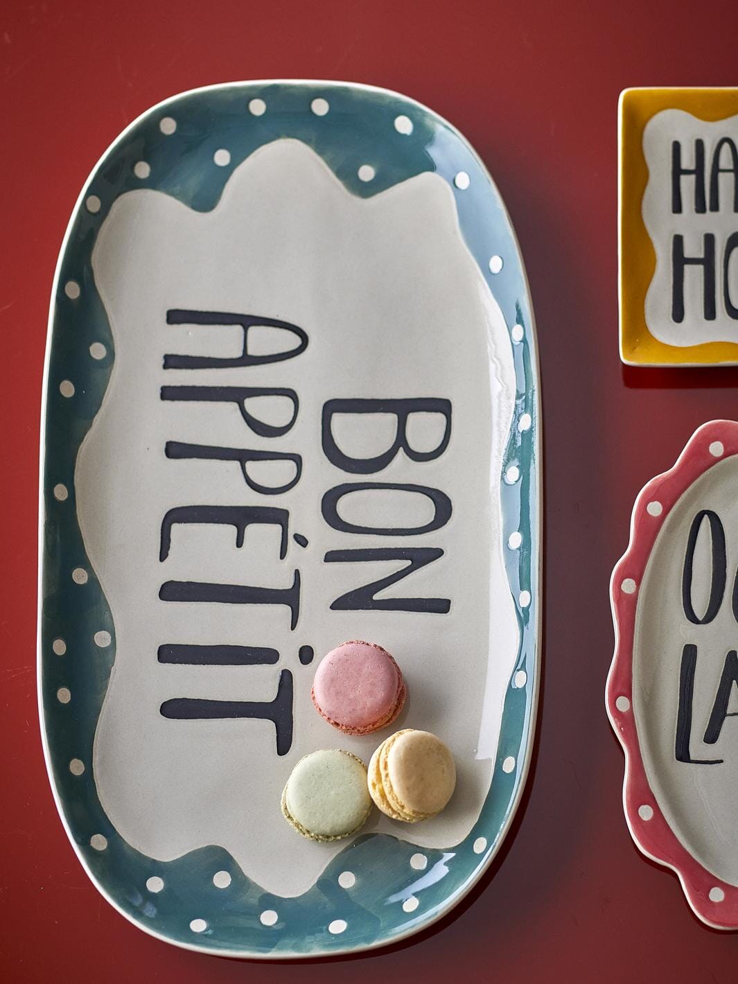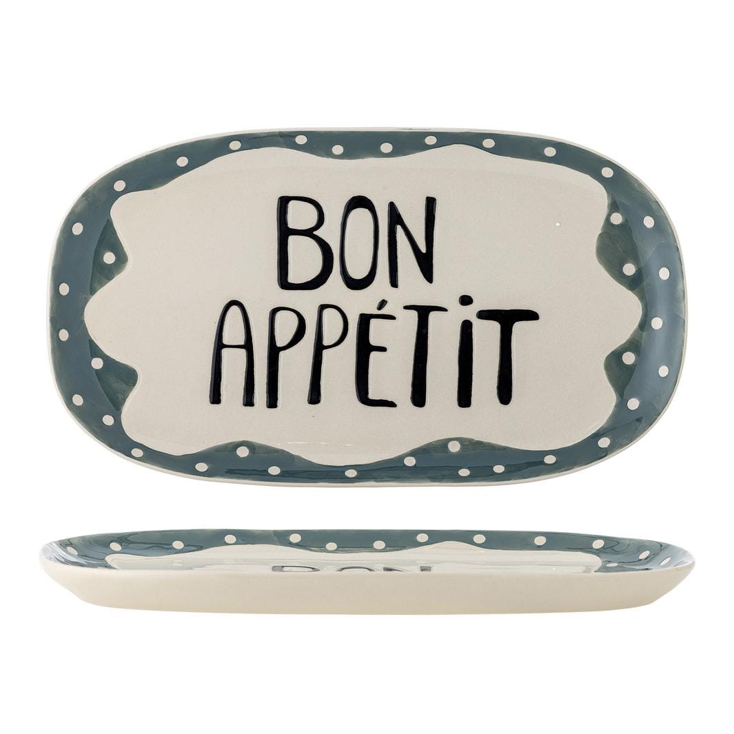 Servierplatte von Bloomingville, hergestellt aus Steingut. Handbemalte Details mit dem Schriftzug Bon Appétit in der Mitte. Der Rand hat weiche Linien und kleine weiße Punkte auf einem blaugrünen Untergrund.