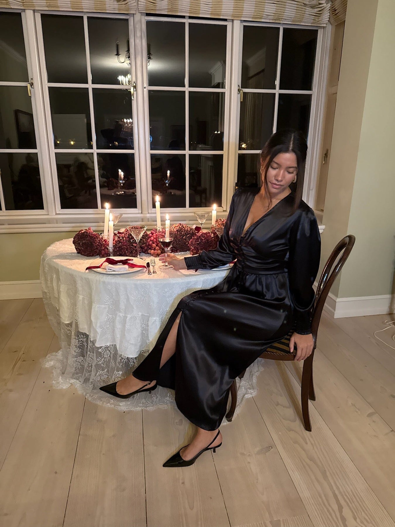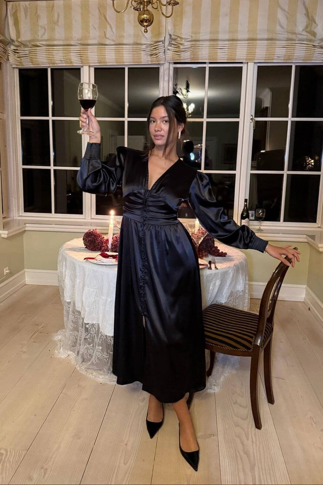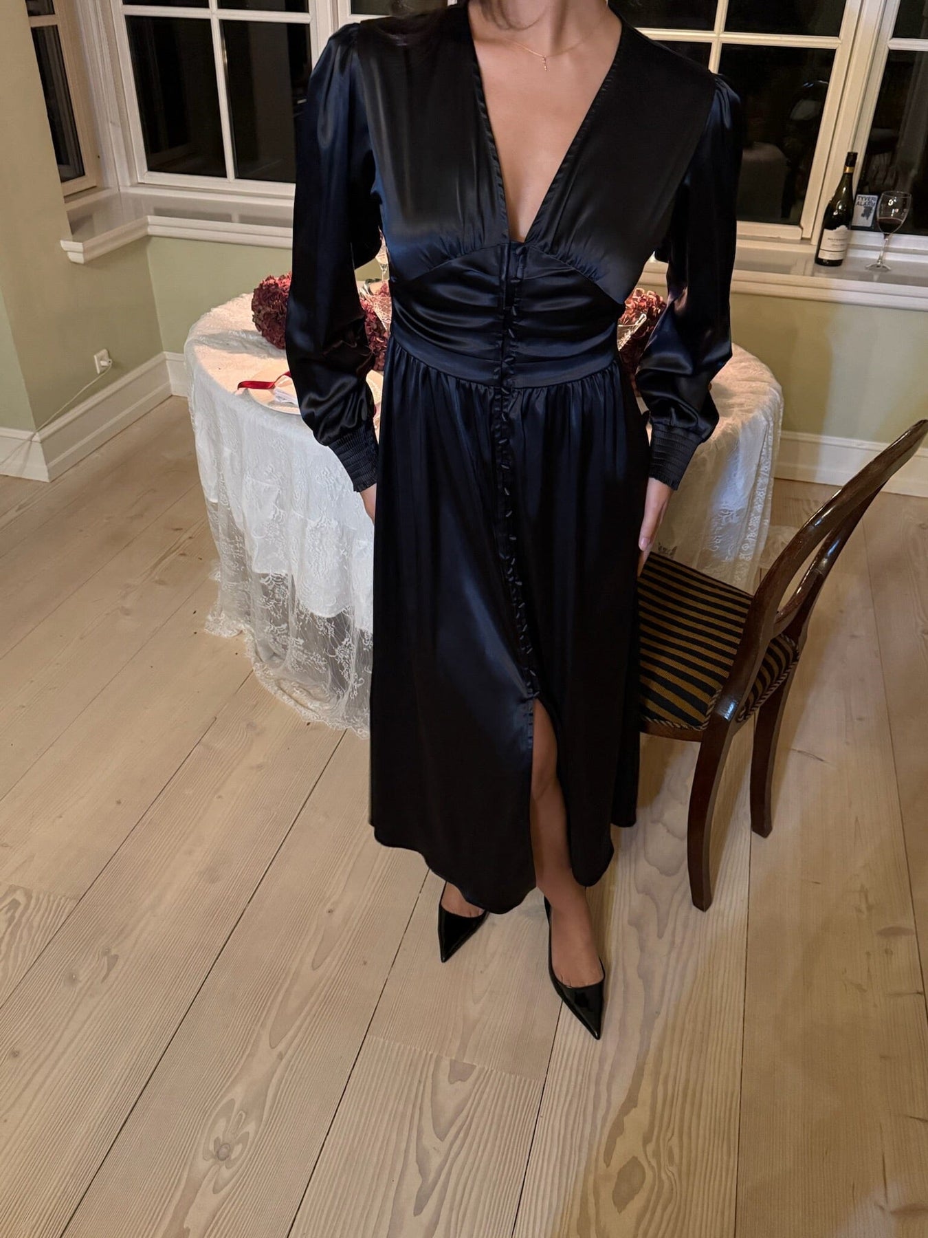 Schwarzes Satin-Kleid von BYIC mit glänzender Oberfläche. Das Kleid hat einen V-Ausschnitt, Knöpfe entlang der Vorderseite und eine betonte Taille mit Rüschendetails. Die langen Ärmel haben geraffte Manschetten mit Elastik.