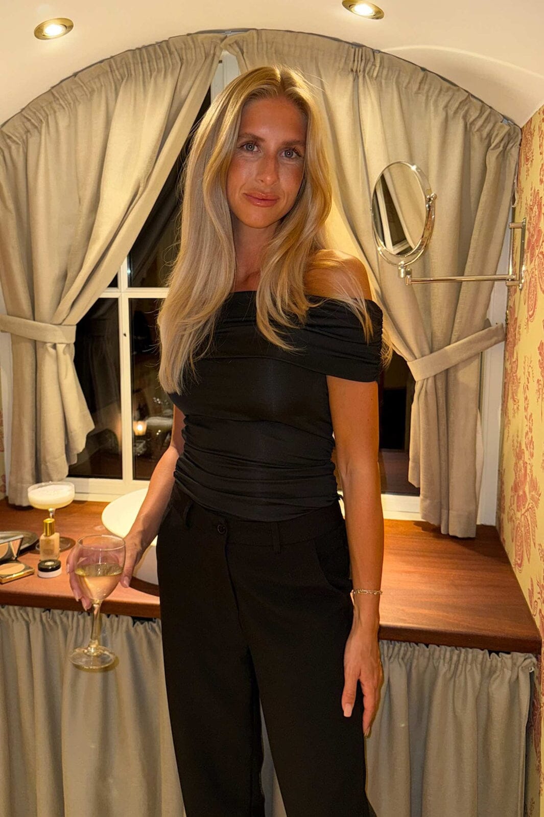 Schwarzes Top von BYIC mit Off-Shoulder-Design. Das Top hat geraffte Details an den Seiten und an den Schultern. Das figurbetonte Modell besteht aus dehnbarem Stoff.