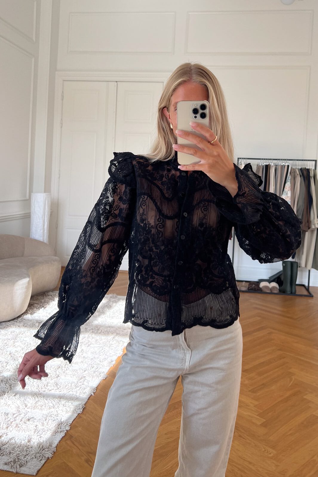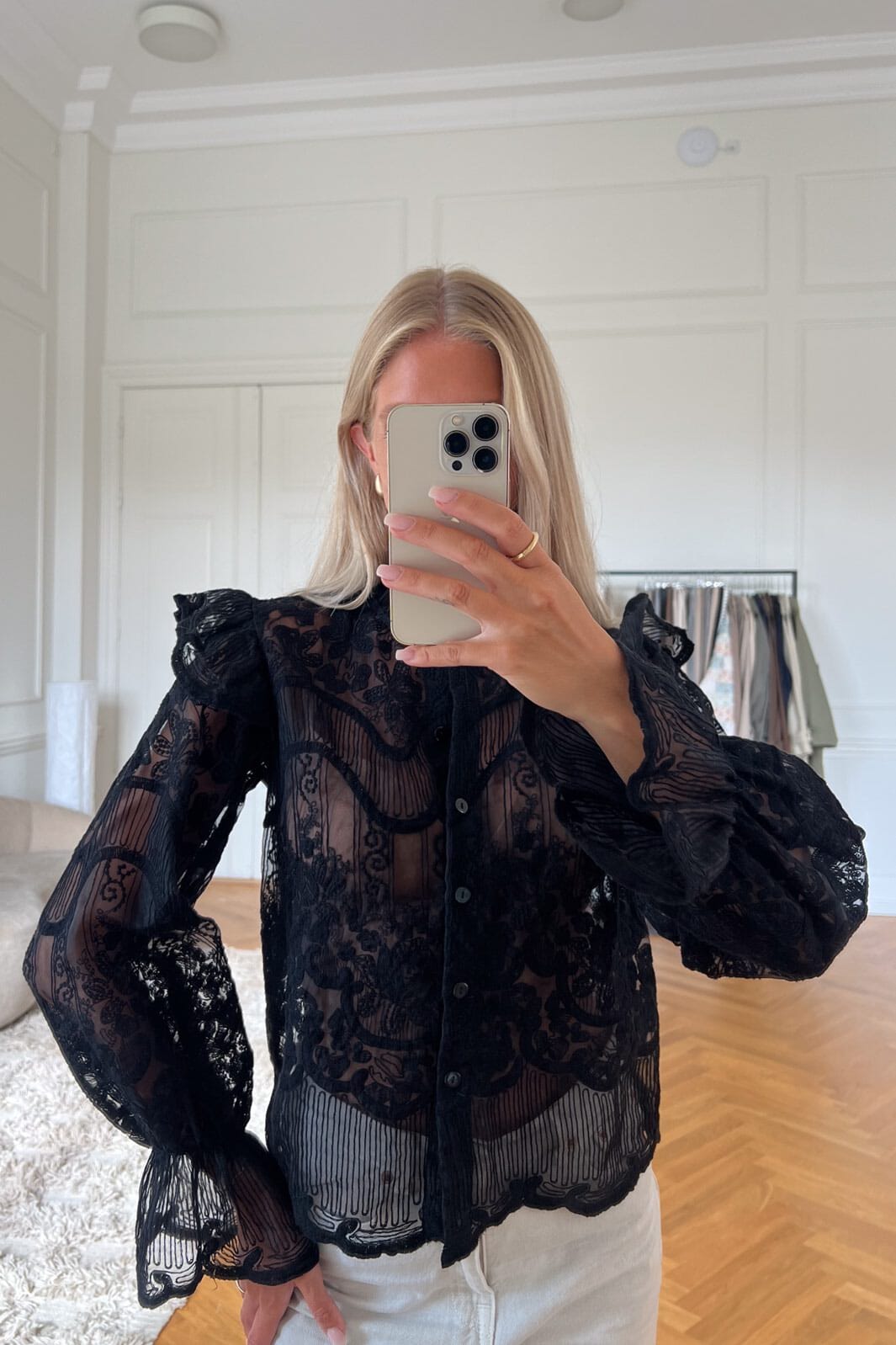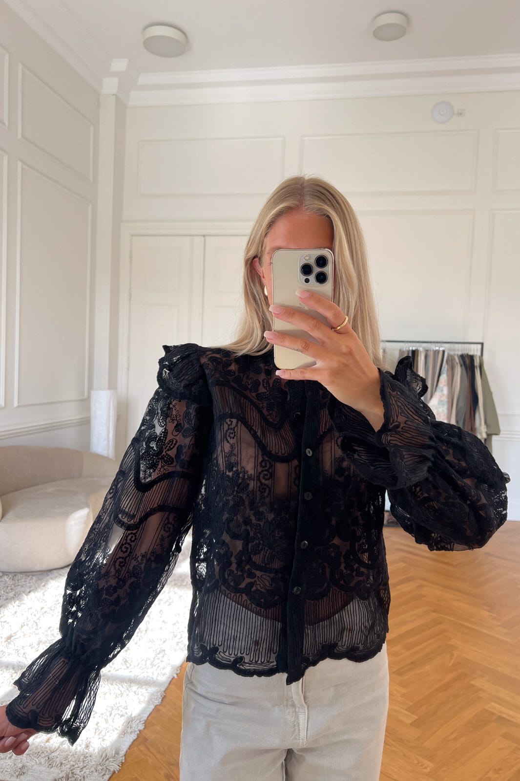 Schwarzes Hemd aus transparenter Spitze mit hohem Kragen und Knopfleiste. Das Hemd hat Puffärmel mit Rüschendetails und eine lockere Passform, die es sowohl für den Alltag als auch für Feste geeignet macht.