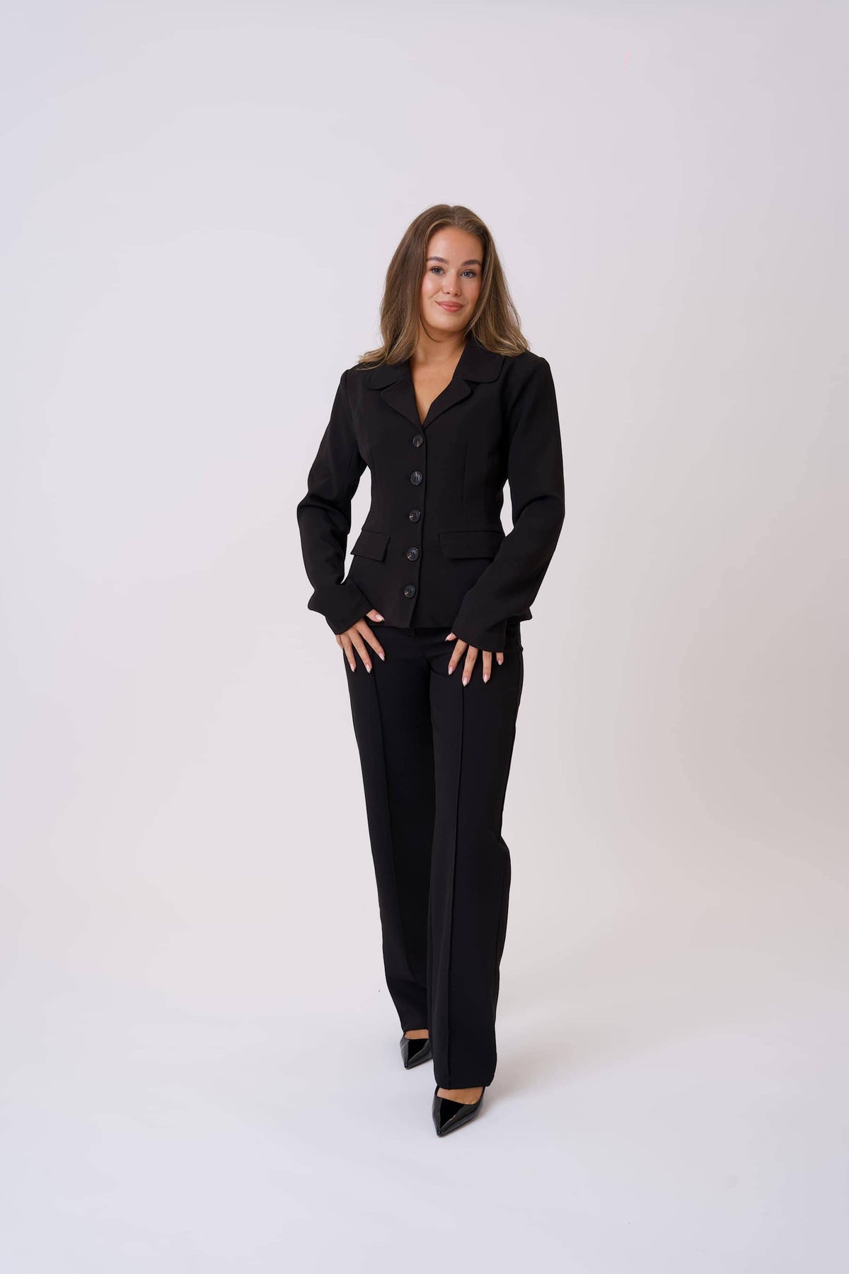 Schwarzer Blazer von BYIC mit Slim-Fit-Schnitt. Der Blazer hat einen klassischen Hemdkragen, Knöpfe in Naturfarben und zwei Klappentaschen vorne. Der strukturierte Stoff sorgt für eine betonte Taille.