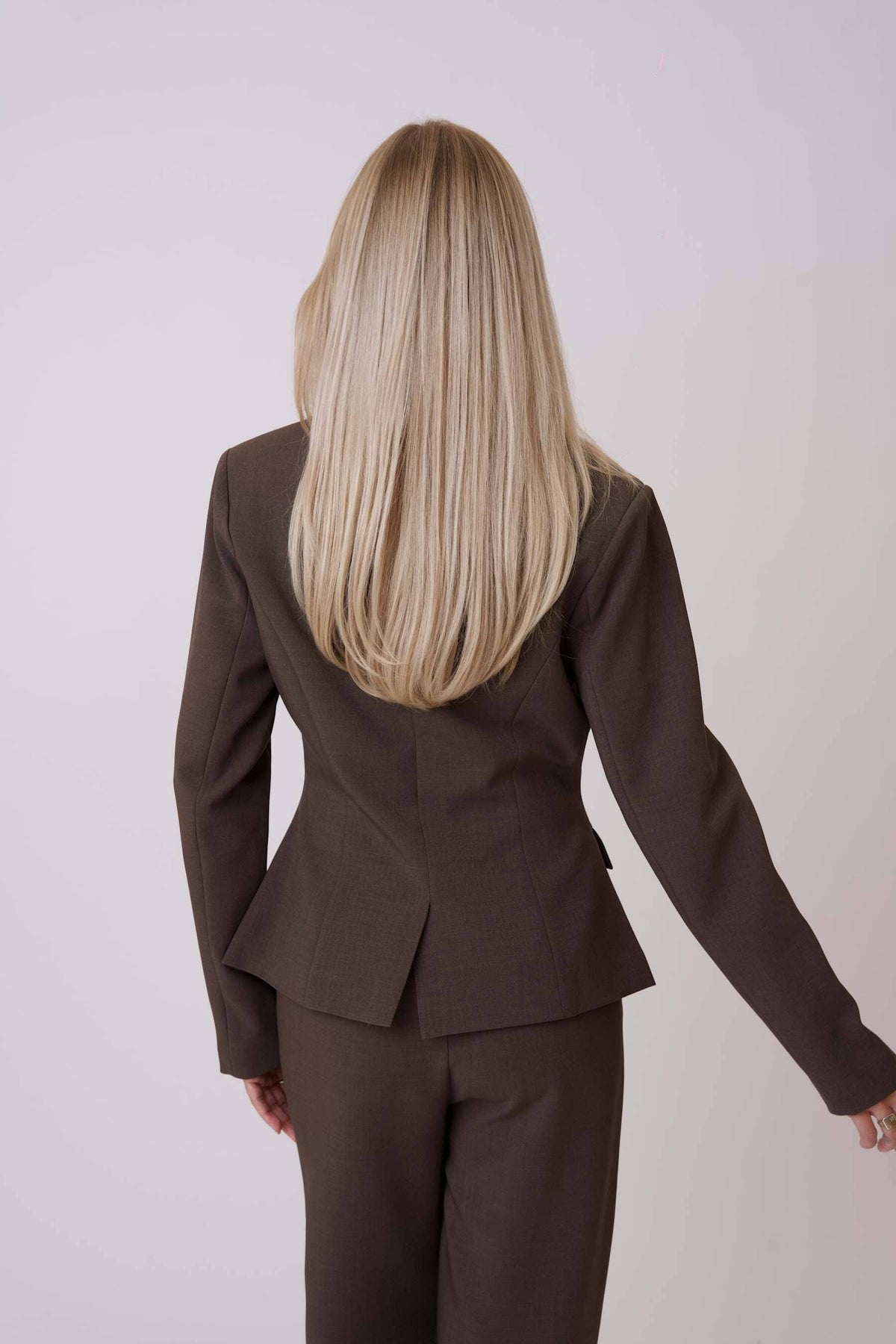 Dunkelbrauner Blazer von BYIC mit maßgeschneiderter Passform. Der Blazer hat einen klassischen Hemdkragen, lange Ärmel und fünf Knöpfe in Naturtönen vorne. Der weiche, strukturierte Stoff bietet guten Komfort.