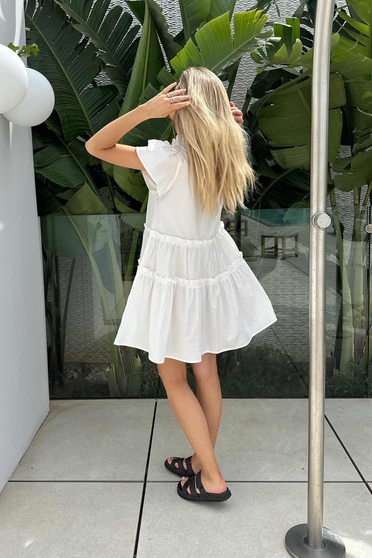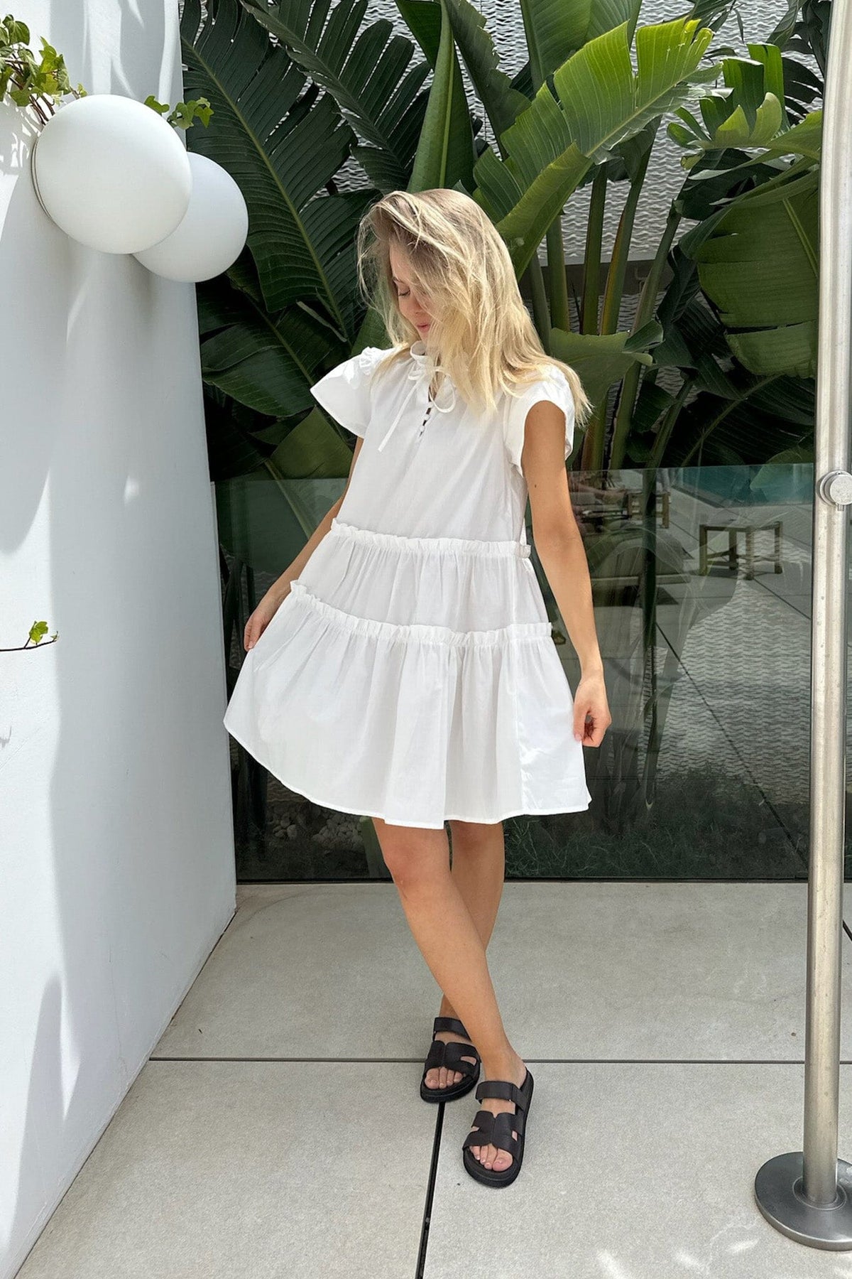 Weißes Kleid von BYIC mit geschichteten Volants und Peter Pan-Kragen. Kurze Ärmel mit Volantdetails und Bindeband am Hals verleihen dem Kleid eine feminine Note.