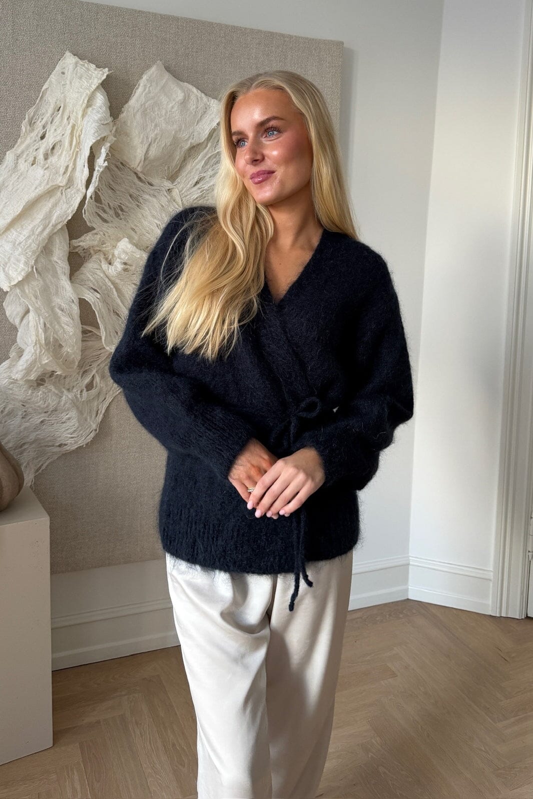 Dunkelblaue Wickelcardigan von BYIC mit flauschiger Textur. Die Cardigan hat einen tiefen V-Ausschnitt und einen Gürtel in der Taille.