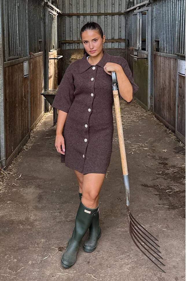 Dunkelbraunes Strickkleid von BYIC mit Hemdkragen und Knöpfen bis nach unten. Es hat 3/4-Ärmel und einen geraden Schnitt, der bis zur Mitte des Oberschenkels reicht.