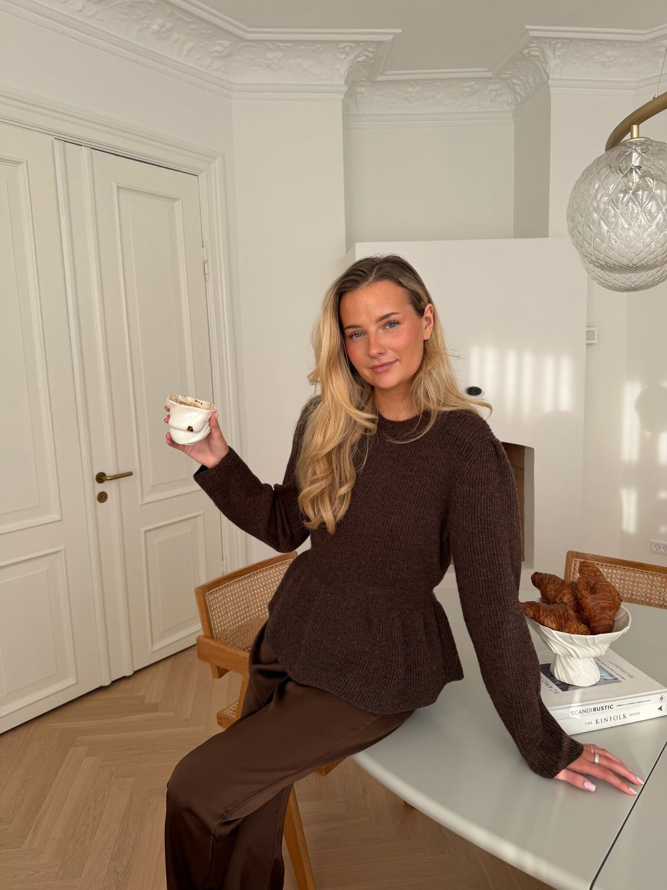 Dunkelbrauner Pullover von BYIC mit Rippstrickstruktur und Schößchen-Effekt in der Taille. Der Pullover hat eine Slim-Fit-Passform und einen Rundhalsausschnitt.