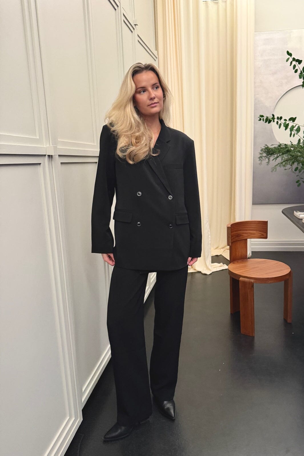 Schwarzer, doppelreihiger Blazer von BYIC mit Oversized-Passform. Der Blazer hat einen V-Ausschnitt, lange Ärmel und einen Schlitz hinten.