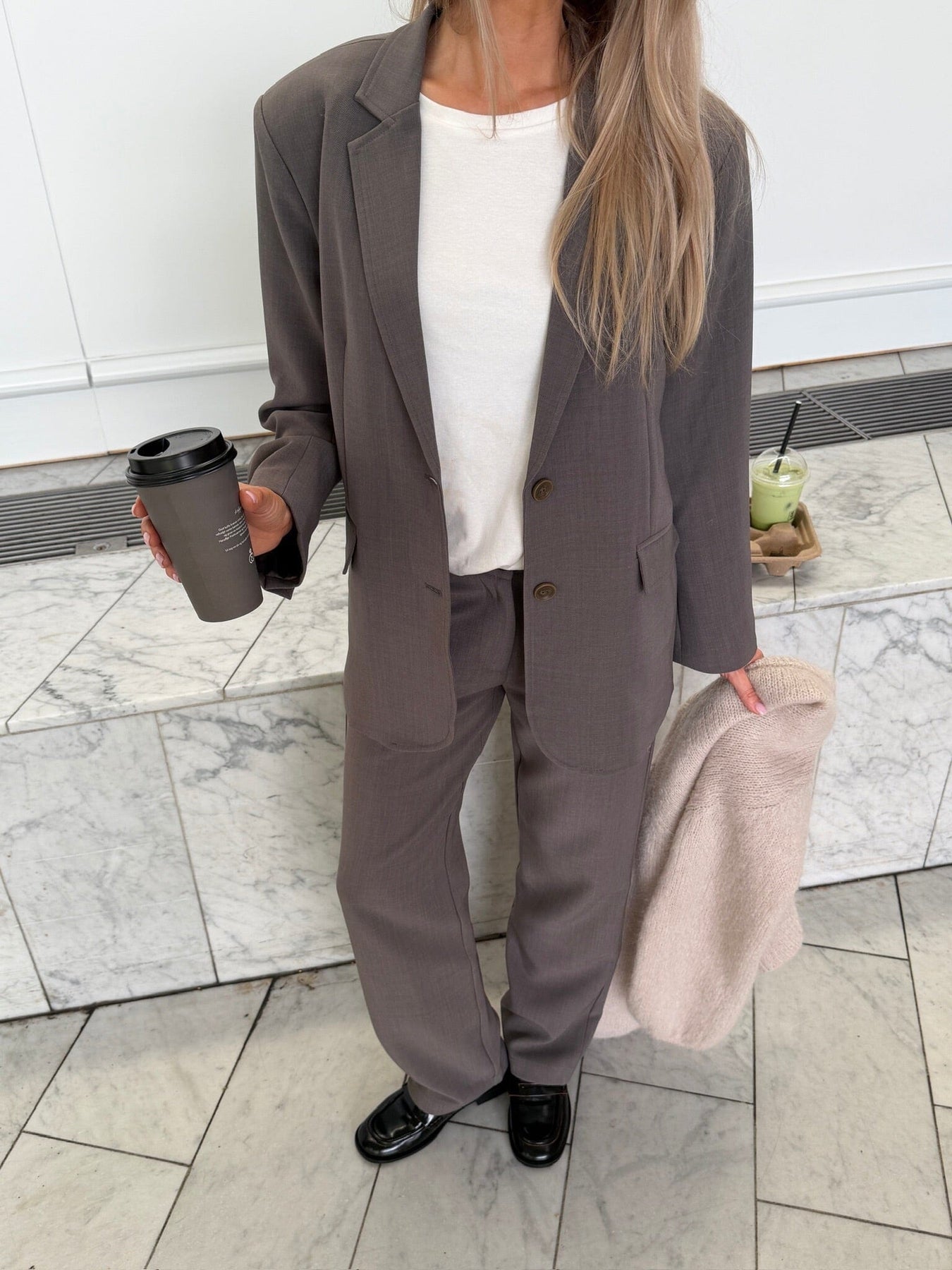 Graue Hose von BYIC aus Polyester. Die Hose hat ein gerades Bein mit Gürtelschlaufen und sichtbaren Seitentaschen, was sie sowohl für legere als auch für formelle Anlässe praktisch macht.